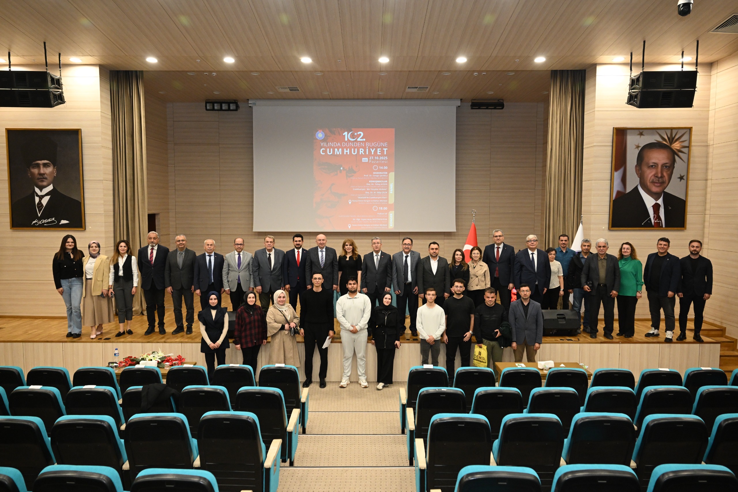 Panelin ikinci konuşmacısı Doç. Dr. M. Edip Çelik ise “Atatürk’te Cumhuriyet Fikri” başlıklı sunumunda Cumhuriyetin anlamına değinerek, “Egemenlik kayıtsız şartsız milletindir. Cumhuriyet, belli bir zümrenin değil halkın iradesidir. Demokrasiyle birlikte yaşar, onunla güçlenir.” dedi. Çelik, Cumhuriyetin değerini en iyi anlamanın yolunun çevremizdeki coğrafyaya bakmaktan geçtiğini belirterek, “Cumhuriyetin yaşaması, genç nesillerin adalete, bilgiye ve eşitliğe sahip çıkmasıyla mümkündür. Bu topraklar için mücadele eden kahraman gazilerimizi ve aziz şehitlerimizi rahmetle anıyor, Cumhuriyetimizin 102. yılını kutluyorum.” dedi.