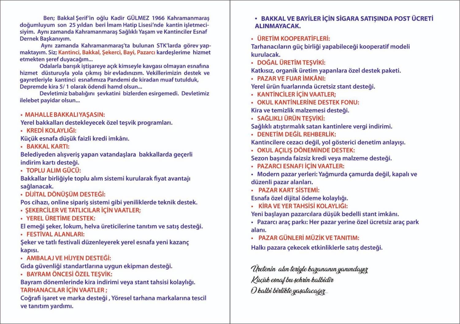 Kahramanmaraş’ın tanınan simalarından biri olan Gülmez, “Birlikte Başaracağız” sloganıyla çıktığı yolda, küçük ölçekli esnafın yeniden güçlenmesi için geniş bir reform paketi hazırladı.