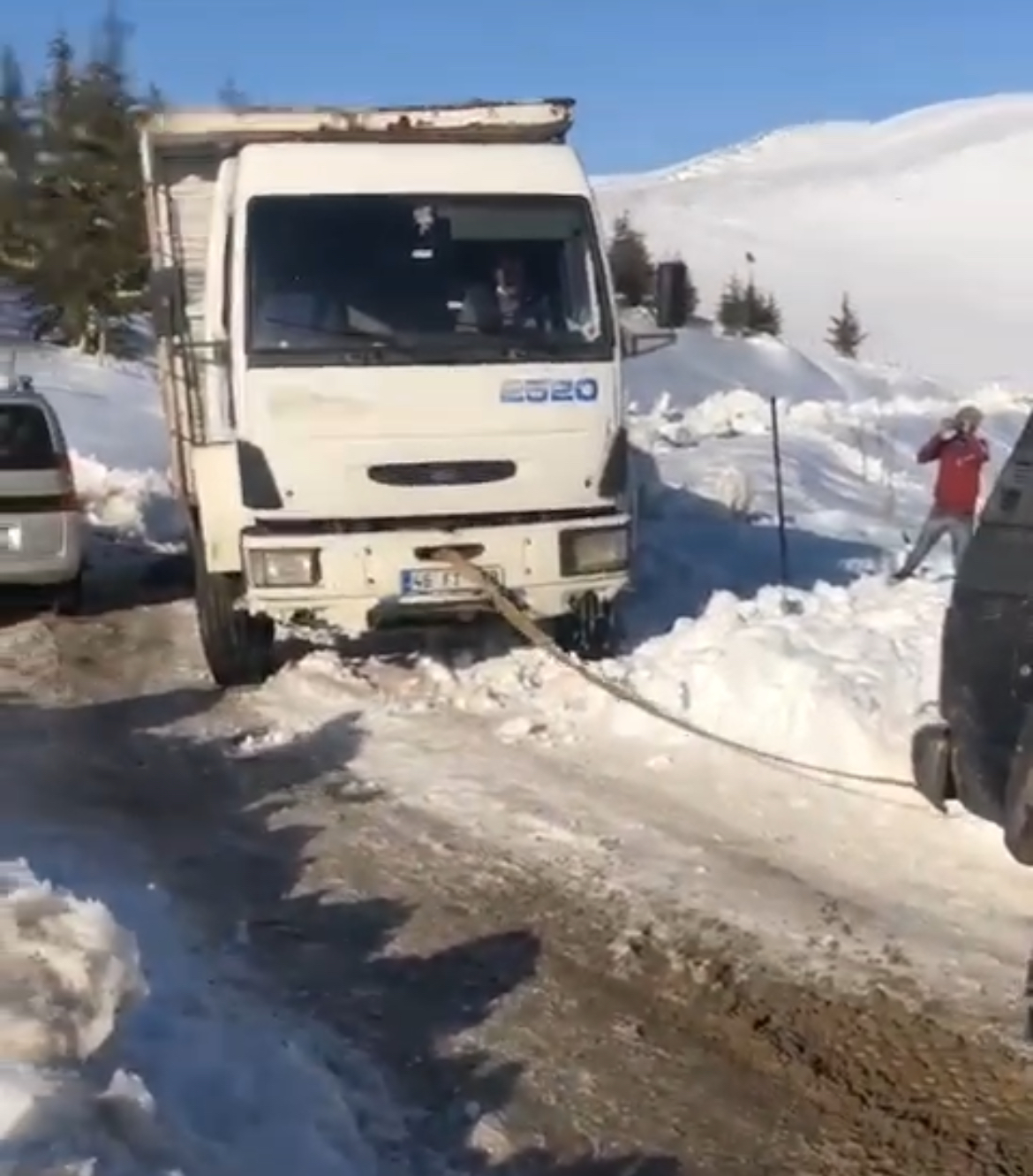 Ahır Dağı’nın yaklaşık 1.600 metre rakımındaki Karagöl yolunda ilerlemekte zorlanan kamyon, kar ve buzlanma nedeniyle yolda kaldı. Durumun bildirilmesi üzerine bölgeye ulaşan Ökkeş Güner, 4x4 off-road aracı, halat yardımıyla kamyonu güvenli alana çekti. Kurtarma çalışması, zorlu arazi koşullarına rağmen kısa sürede ve kontrollü şekilde tamamlandı.