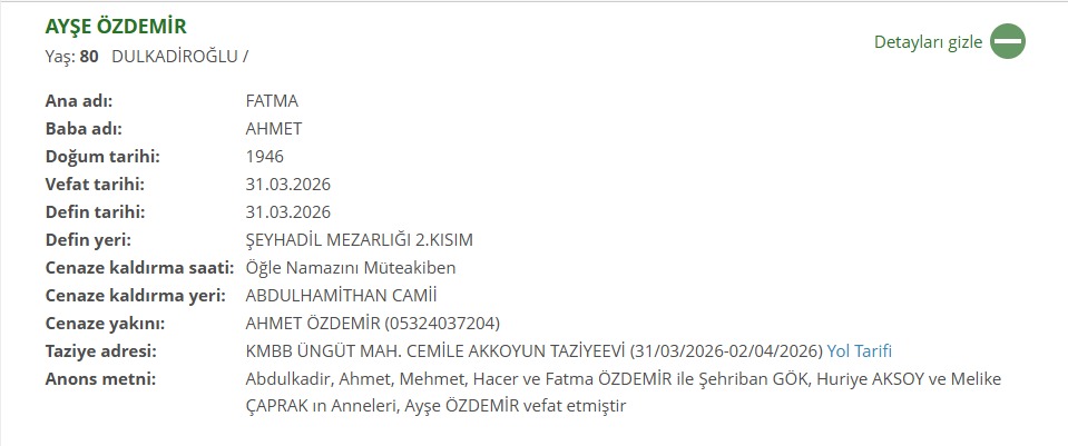 Merhume Ayşe Özdemir’in cenazesi, 31 Mart 2026 (BUGÜN) tarihinde öğle namazına müteakip Abdulhamithan Camii’nde kılınacak cenaze namazının ardından Şeyhadil Mezarlığı 2. Kısım’da defnedilecek. Taziyelerin ise 31 Mart – 2 Nisan 2026 tarihleri arasında KMBB Üngüt Mahallesi Cemile Akkoyun Taziyeevi’nde kabul edileceği bildirildi.