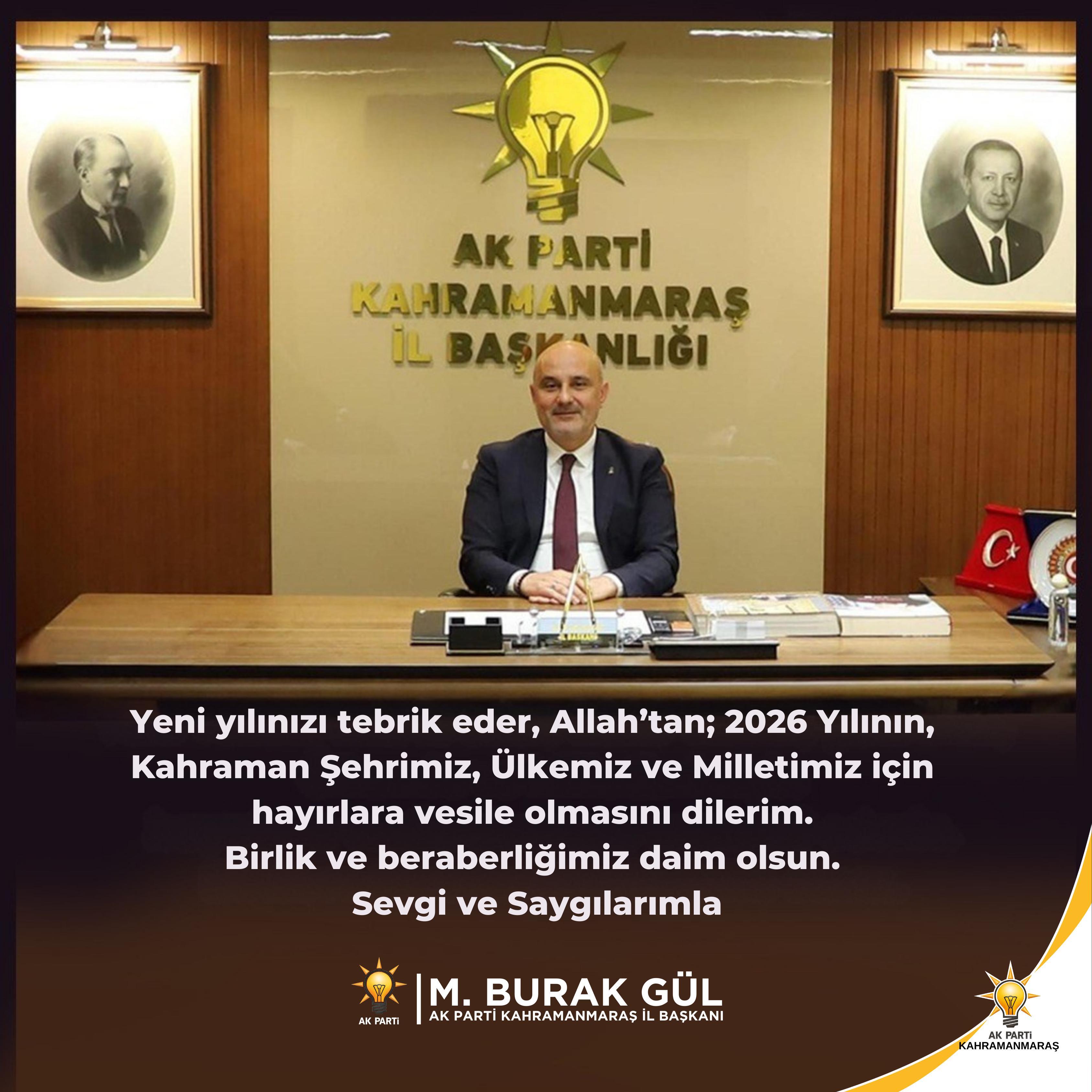 AK Parti Kahramanmaraş İl Başkanı M.Burak Gül, yeni yıl dolayısıyla yayımladığı mesajında, Kahramanmaraş’ın deprem sonrası yeniden ayağa kalkma sürecinde önemli bir eşiğin geride bırakıldığını belirterek, 2026 yılına çok daha güçlü hedeflerle girildiğini ifade etti.