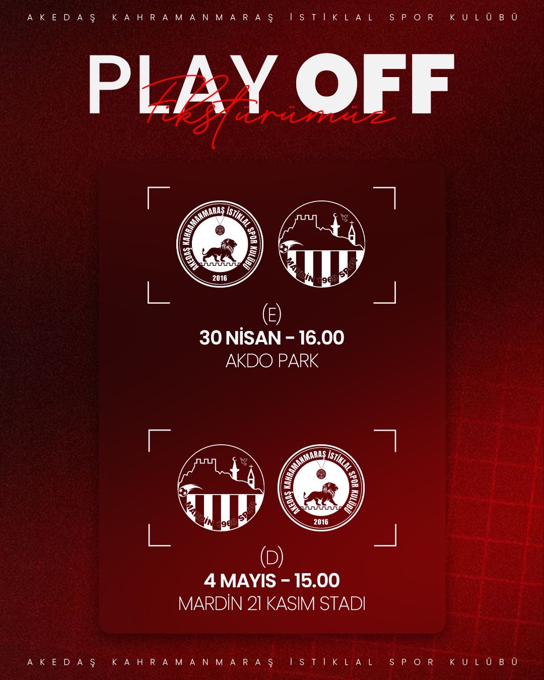 Futbol ve basketbol takımları play-off’taki ilk sınavlarına 30 Nisan Perşembe günü çıkacak. Kahramanmaraş İstiklalspor, saat 16.00’da AKDO Park’ta Mardin 1969 Spor’u konuk edecek. İstiklal Basket ise aynı gün saat 20.00’de deplasmanda Karataş Şahinbey Spor Salonu’nda Gaziantep Basketbol ile karşı karşıya gelecek.