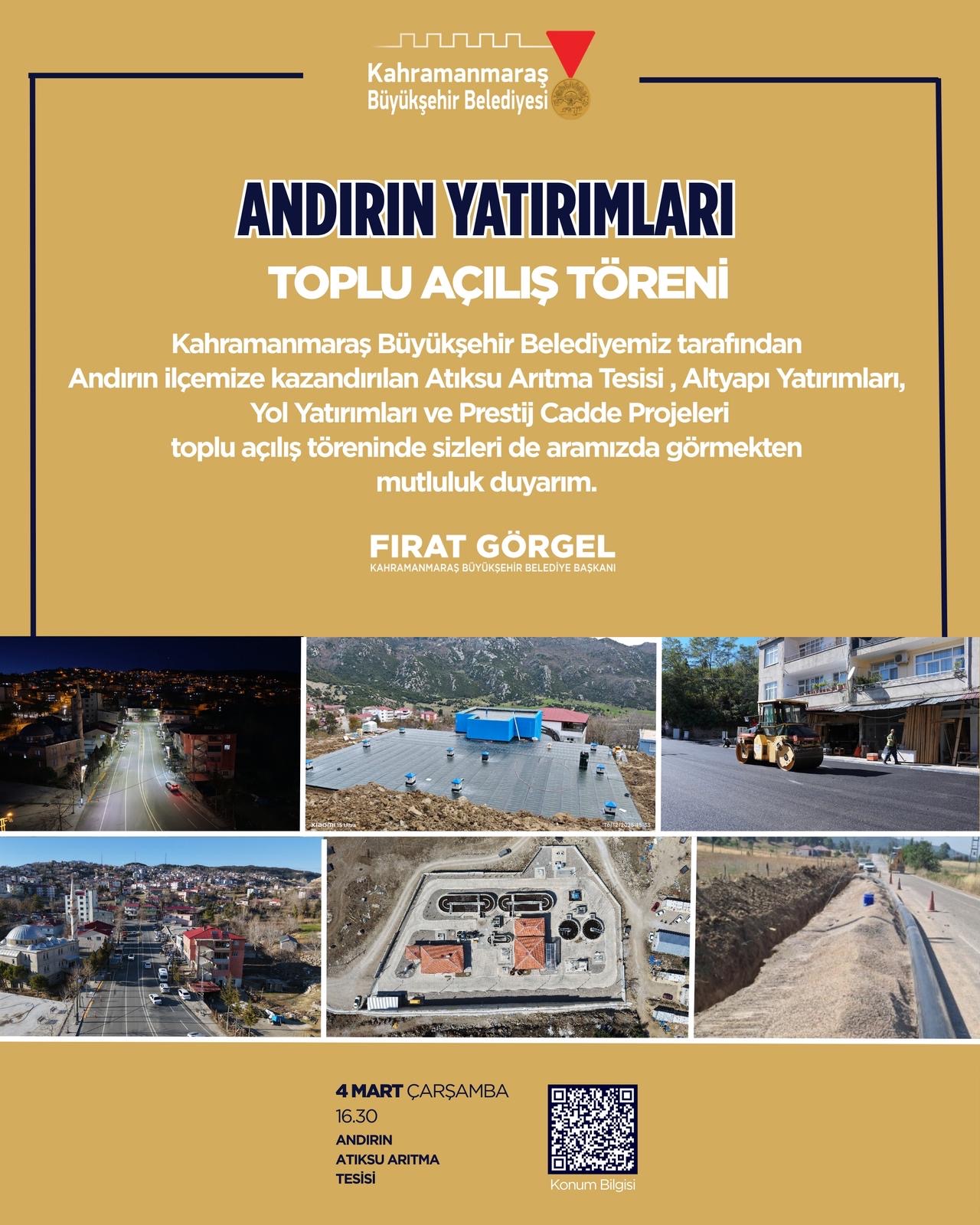 Büyükşehir Belediyesinin yatırımlarıyla sadece Kahramanmaraş’ın değil, bölgenin de sosyal ve kültürel cazibe merkezi olma yolunda ilerleyen Andırın, yeni yatırımlarıyla katma değerini katbekat artırıyor. Bu kapsamda; Büyükşehir Belediyesi tarafından ilçeye kazandırılan; Atıksu Arıtma Tesisi, altyapı yatırımları, yol yatırımları ve prestijcadde projelerinin toplu açılış töreni gerçekleştirilecek. 4 MartÇarşamba günü saat 16.30’da Andırın Atıksu Arıtma Tesisi’nde gerçekleştirilecek olan toplu açılış törenine tüm vatandaşlar davet edildi.