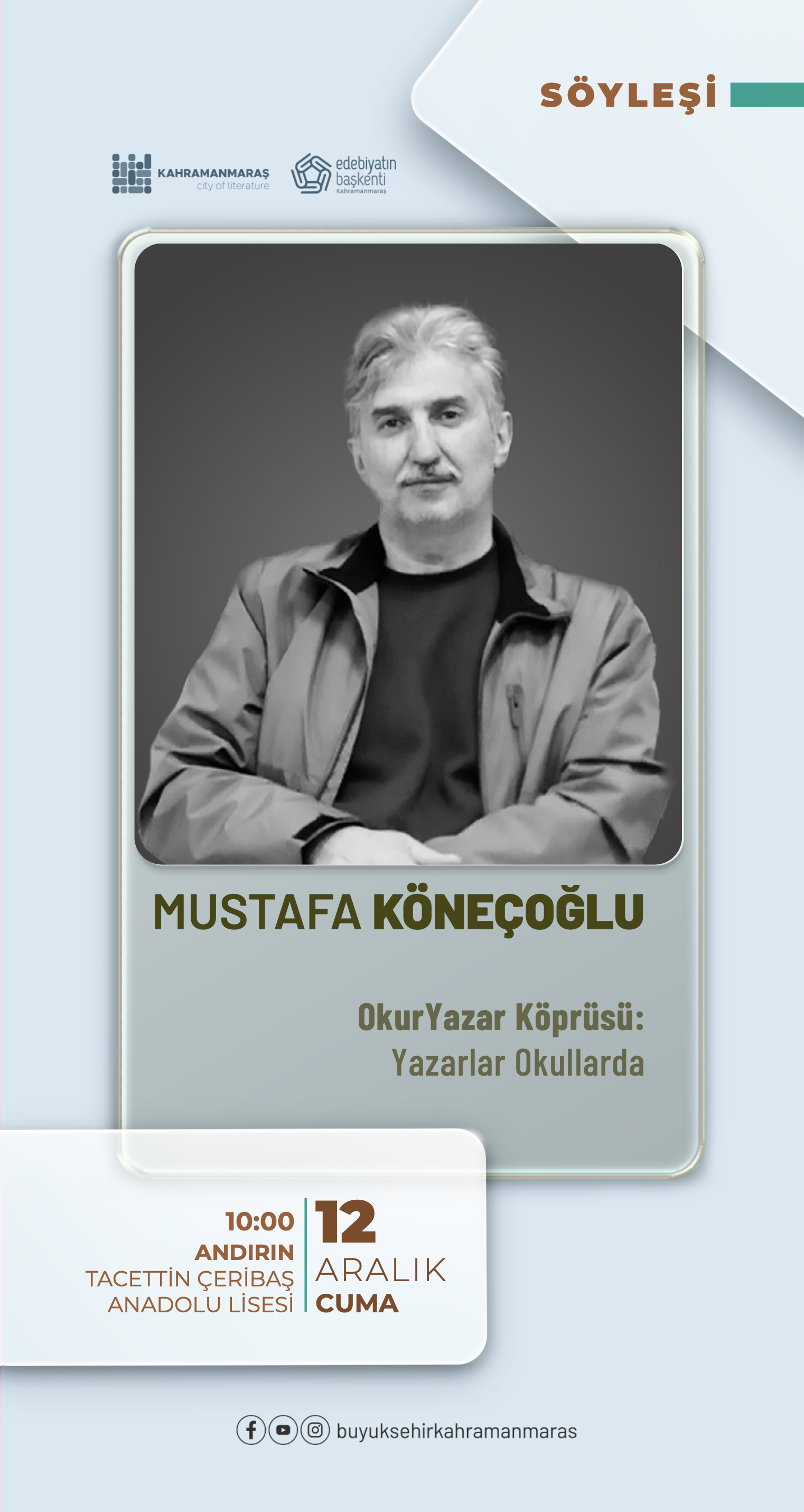 Büyükşehir Belediyesi, okur – yazar buluşmaları kapsamında 12 Aralık Cuma günü Andırın Tacettin Çeribaş Anadolu Lisesi’nde yazar Mustafa Köneçoğlu’nun katılımıyla özel bir söyleşi programı gerçekleştirecek.