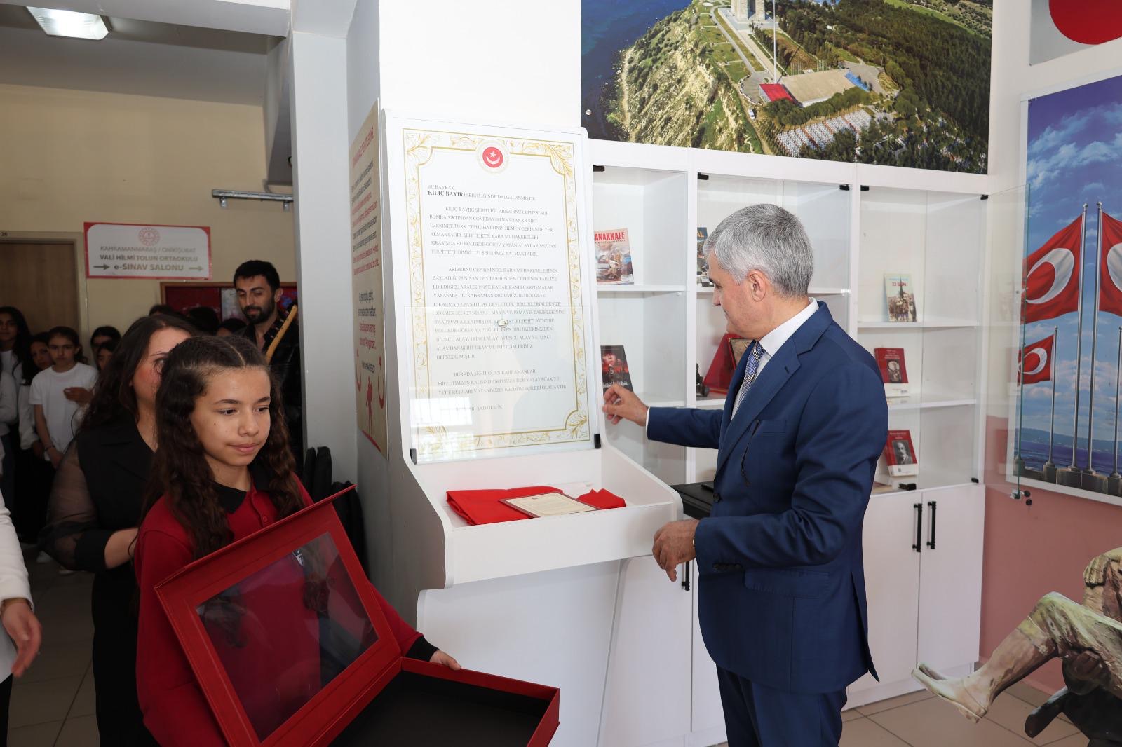 Çanakkale Kılıç Bayırı Şehitliği’nde dalgalanan bayrak, Vali Hilmi Tolun Ortaokulu’na törenle teslim edildi.