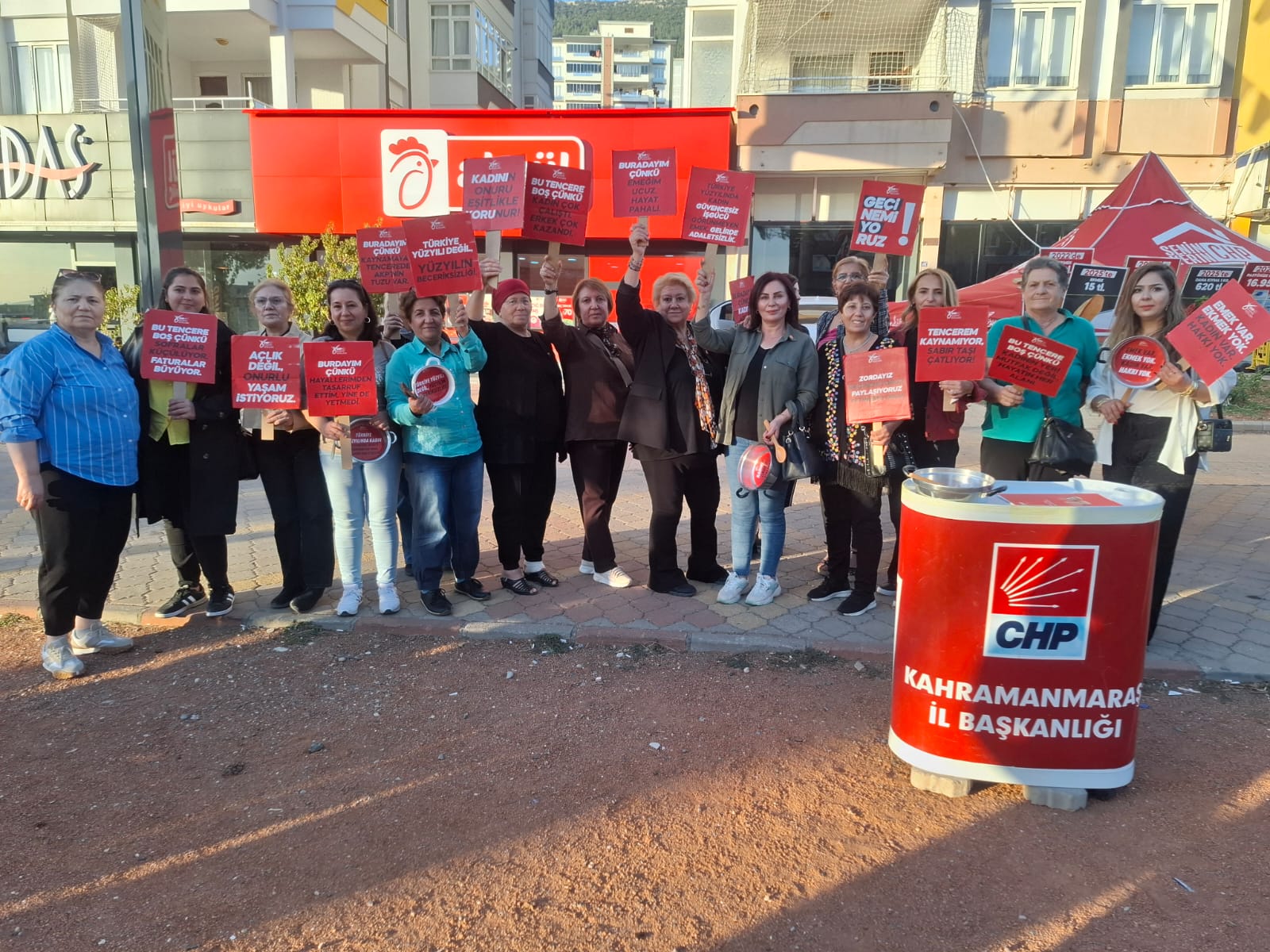 CHP Kahramanmaraş İl Kadın Kolları Başkanı Lütfiye Köroğlu, parti binası önünde yaptığı basın açıklamasında, yoksulluğun kadınlar üzerindeki etkisini vurguladı.