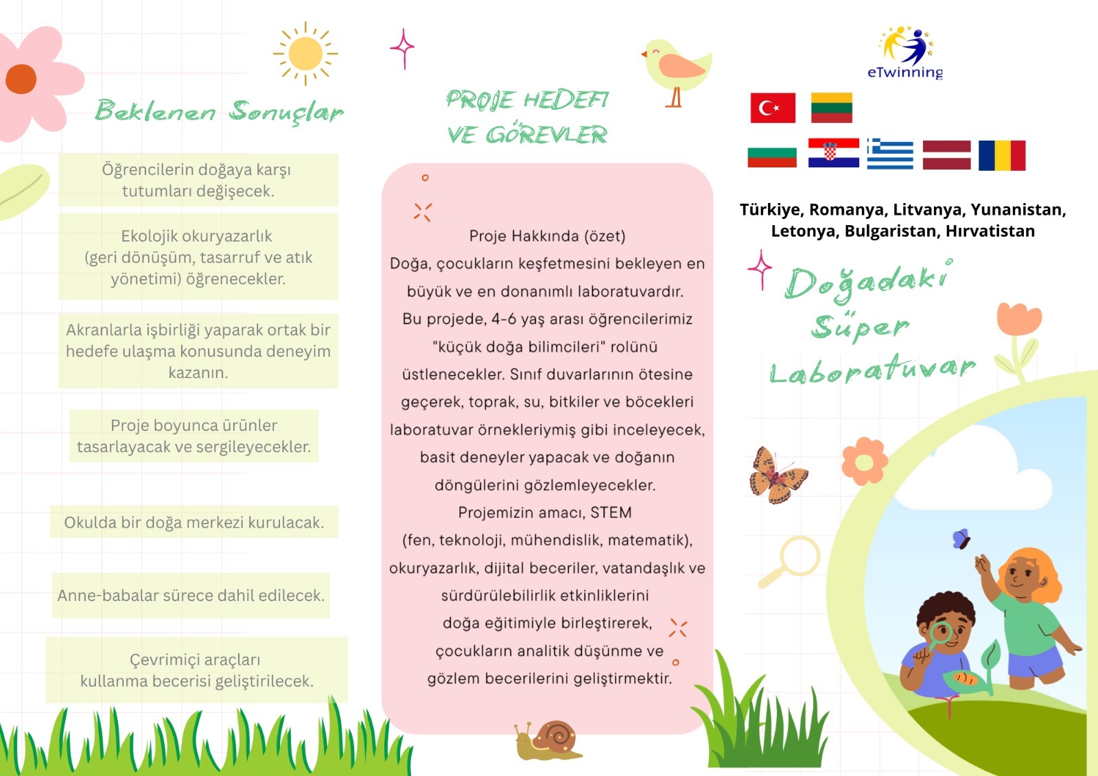 Uluslararası ortaklı “Nature’s Super Laboratory” eTwinning Projesi, farklı ülkelerden öğrencileri doğa temelli bilim etkinliklerinde buluşturuyor. Türkiye’nin yanı sıra Bulgaristan, Romanya, Hırvatistan, Yunanistan, Letonya ve Litvanya’dan eğitim kurumlarının yer aldığı projede, 4-6 yaş grubu çocuklar doğayı bir laboratuvar gibi keşfederek bilimle tanışıyor.