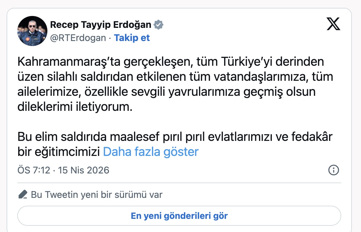 Cumhurbaşkanı Erdoğan'dan Kahramanmaraş'taki saldırıya ilişkin paylaşım