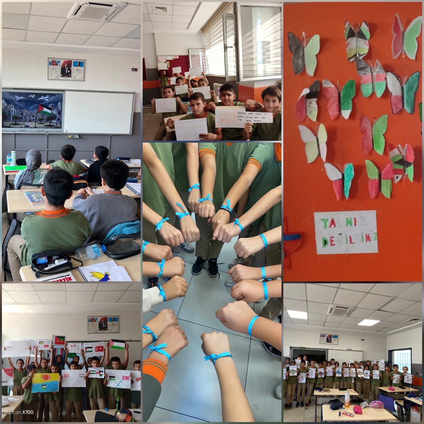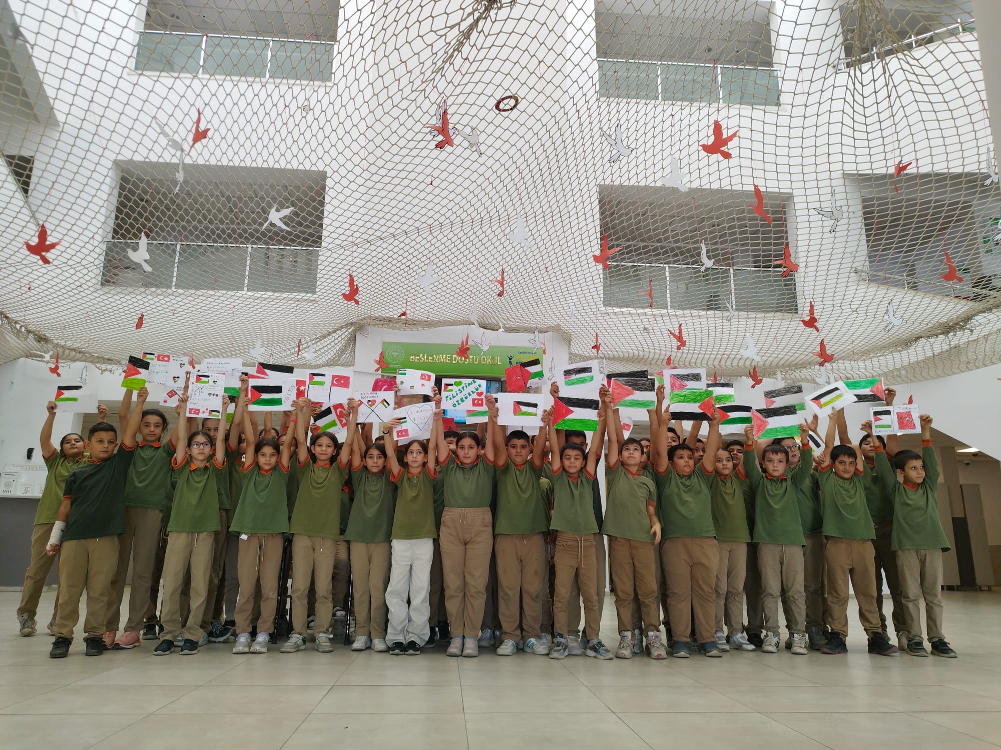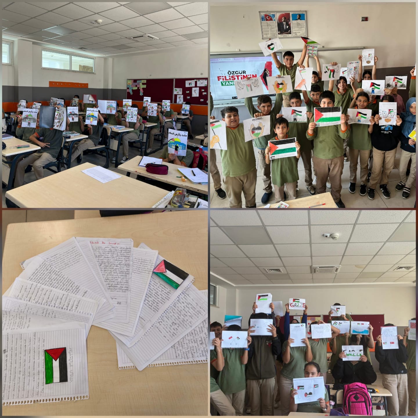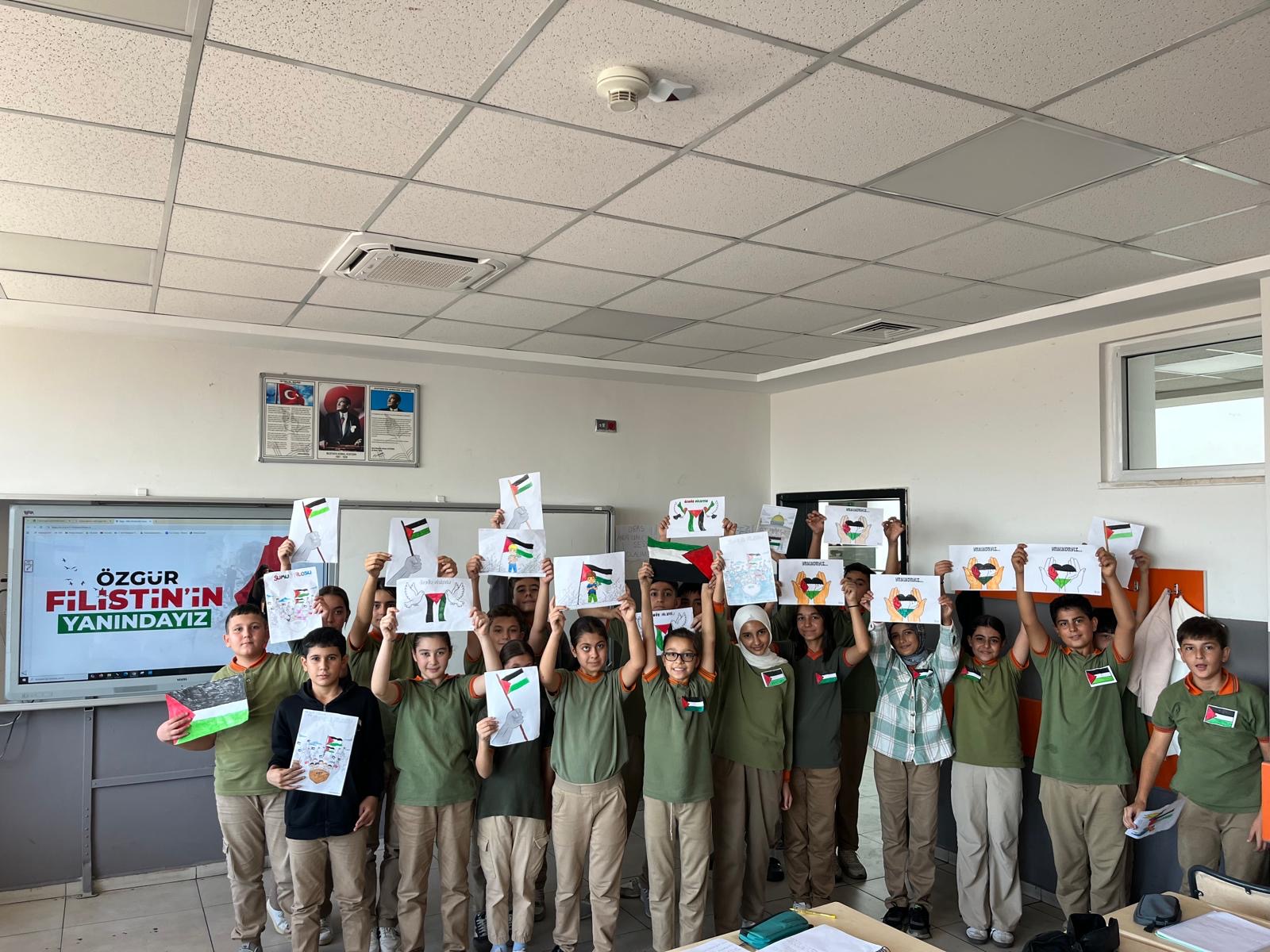 Etkinlik kapsamında tüm sınıflarda öğrenciler, Filistin’de yaşanan insani krize dikkat çekmek için afişler hazırladı, şiirler okudu ve duygu paylaşımlarında bulundu. Okul koridorları, dayanışma ve umut mesajlarıyla süslendi.