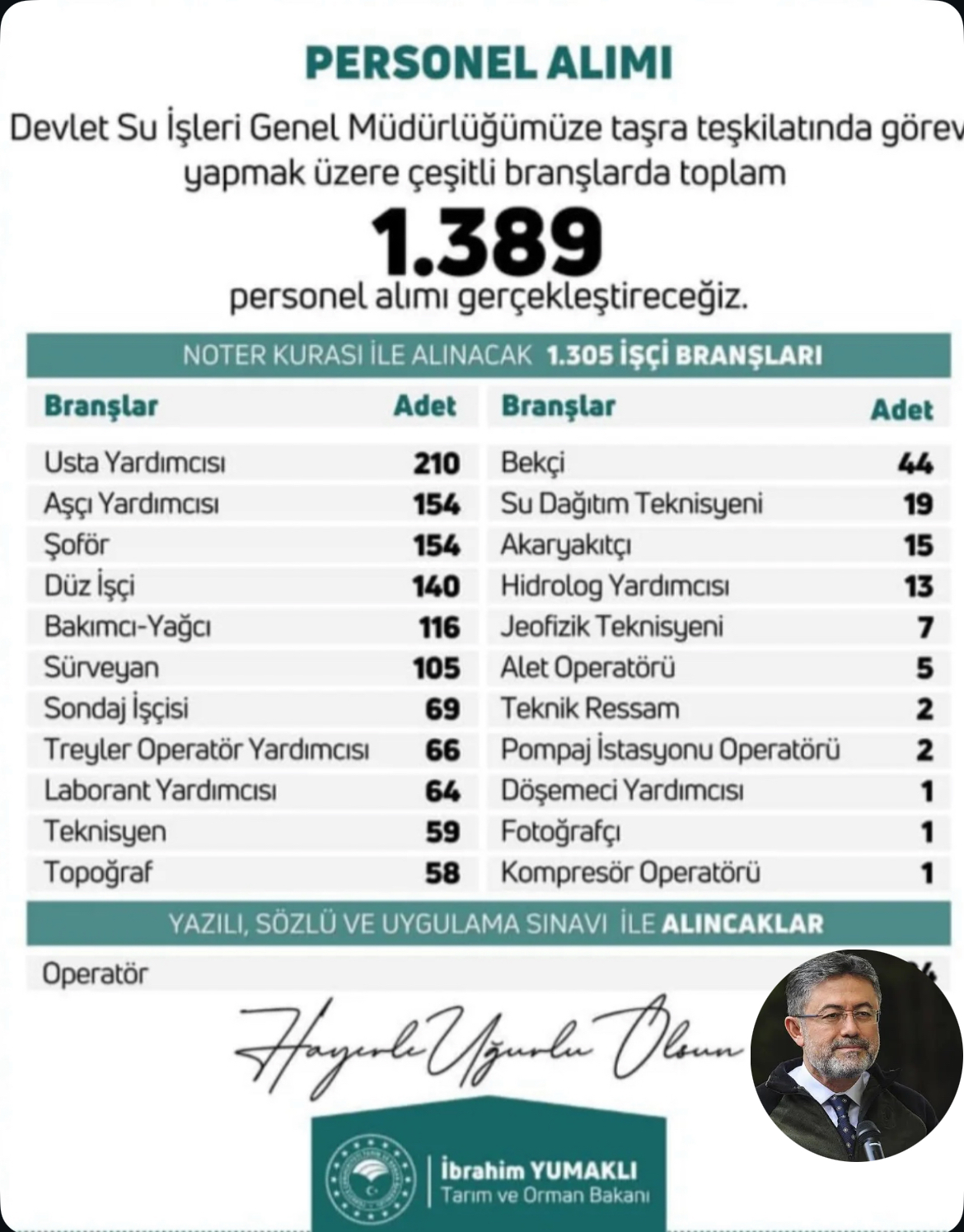 Devlet Su İşleri (DSİ) Genel Müdürlüğü, taşra teşkilatlarında görevlendirilmek üzere farklı branşlarda toplam 1.389 yeni personel istihdam edeceğini açıkladı. Tarım ve Orman Bakanı İbrahim Yumaklı tarafından duyurulan alım kapsamında, noter kurası ile işçi alımı ve yazılı-sözlü-uygulama sınavıyla belirlenen kadrolar bulunuyor.