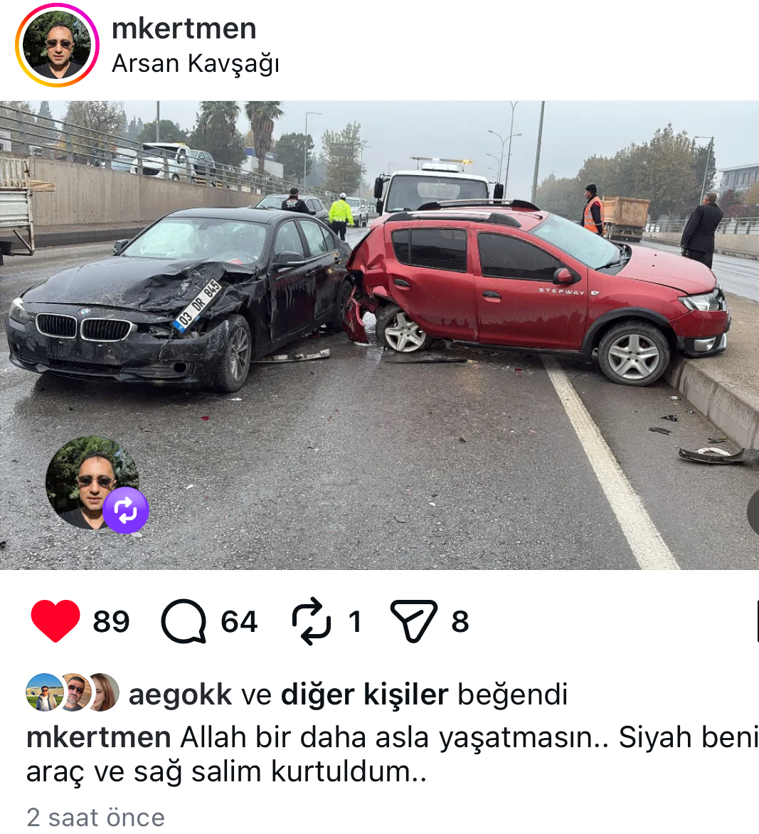 Edinilen bilgilere göre, şehir içi trafikte iki aracın karıştığı kazada araçlarda ciddi hasar meydana geldi. Kazaya karışan siyah renkli aracın sahibi olan iş insanı Mehmet Kertmen, yaşanan olaya ilişkin sosyal medya hesabından paylaşım yaptı.