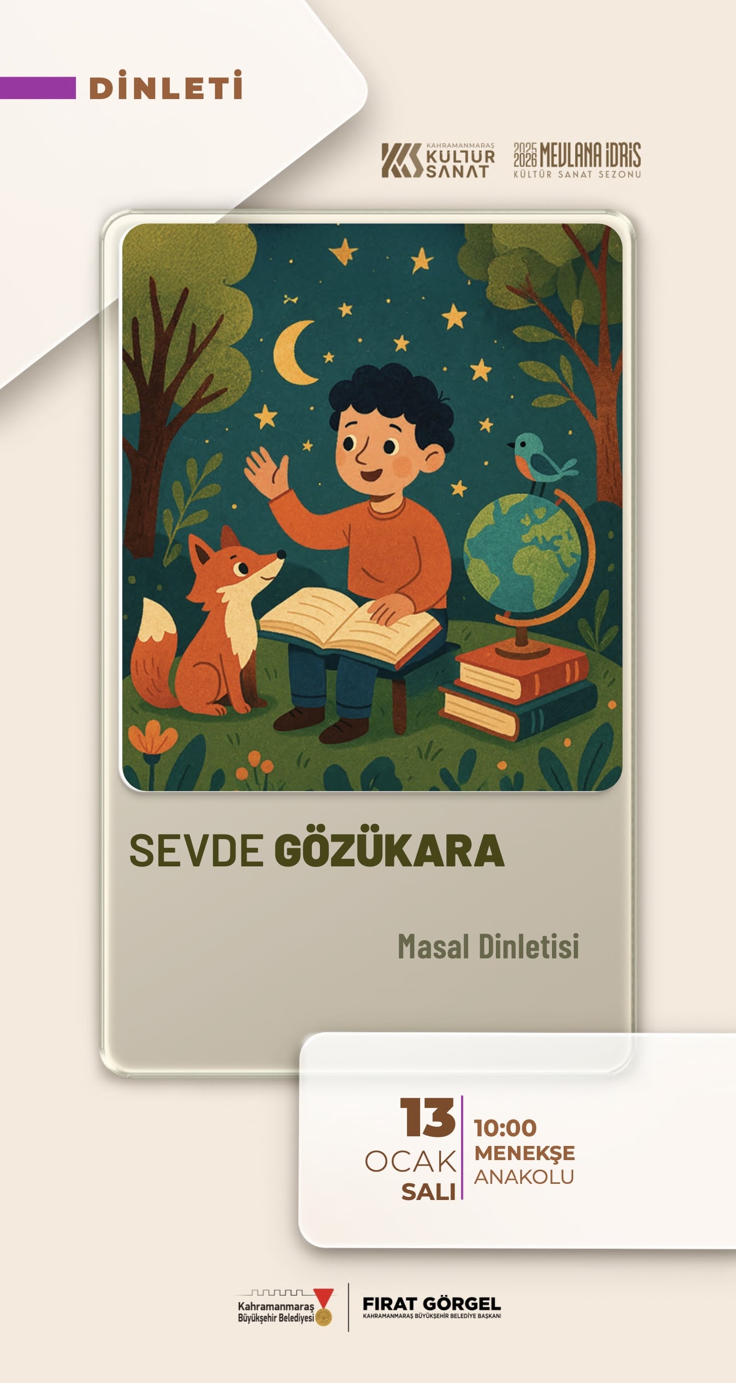 Kahramanmaraş Büyükşehir Belediyesinden yapılan açıklamada, Ocak ayı boyunca düzenlenecek tüm kültür sanat programlarına vatandaşların davetli olduğu belirtilirken, etkinlik takviminin detaylarına https://kahramanmaras.bel.tr/duyuru/2026/01/05/ocak-kultur-sanat-sezonu-etkinlik-takvimi adresi üzerinden ulaşılabileceği ifade edildi.