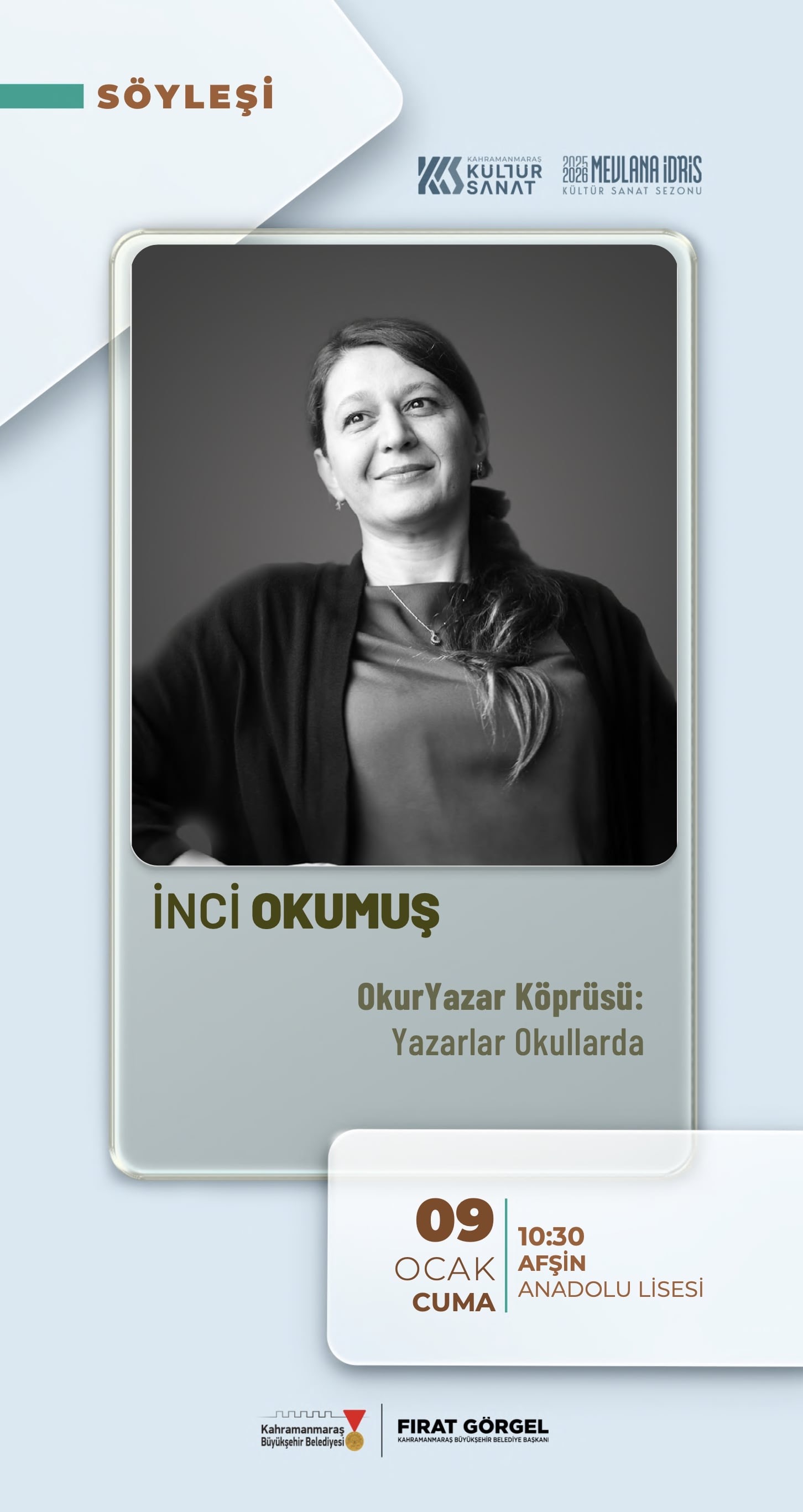 Büyükşehir Belediyesi, kültür sanat etkinliklerini sadece şehir merkeziyle sınırlı tutmayarak ilçelerde de vatandaşlarla buluşturmayı sürdürüyor. Bu kapsamda 8 Ocak Perşembe Kadriye Kırdök, Ekinözü Çok Programlı Anadolu Lisesi’nde; 9 Ocak Cuma İnci Okumuş, Afşin Anadolu Lisesi’nde; 16 Ocak Cuma Merve Gülcemal, Afşin Belediyesi Kültür Merkezi’nde; 24 Ocak Cumartesi ise “Gizemli Çocuk” adlı çocuk tiyatrosu ve “Deliriyorum Haberin Olsun” adlı yetişkin oyunu Andırın YİBO’da vatandaşlarla buluşacak.