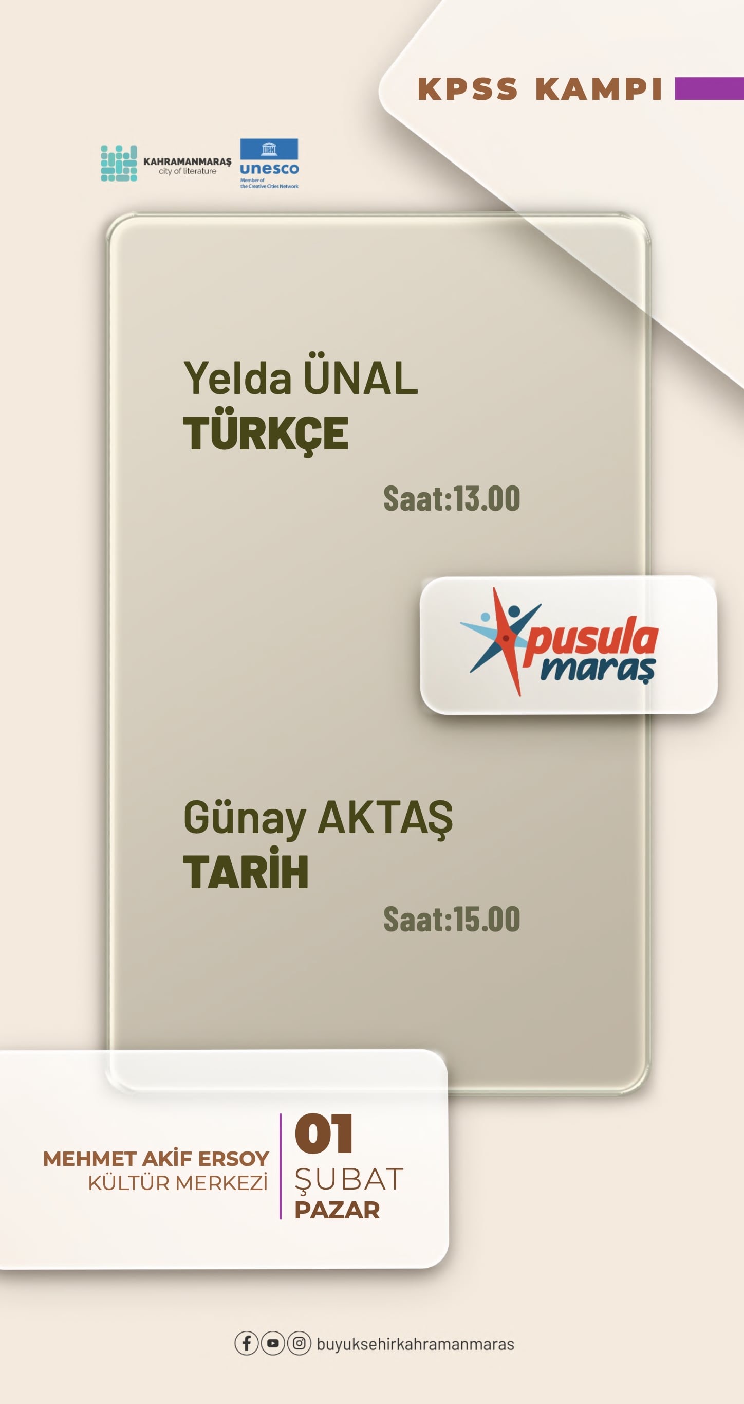 Ay boyunca düzenlenecek söyleşilerle edebiyat dünyasının önemli isimleri Kahramanmaraşlılarla bir araya gelecek. Necip Fazıl Kısakürek Kültür Merkezi Akademi Kütüphanesi’nde gerçekleştirilecek programlarda; 10 Ocak Cumartesi Mustafa Köneçoğlu ve Güray Süngü, 24 Ocak Cumartesi ise Mustafa Köneçoğlu ve Selahattin Yusuf edebiyatseverlere seslenecek.