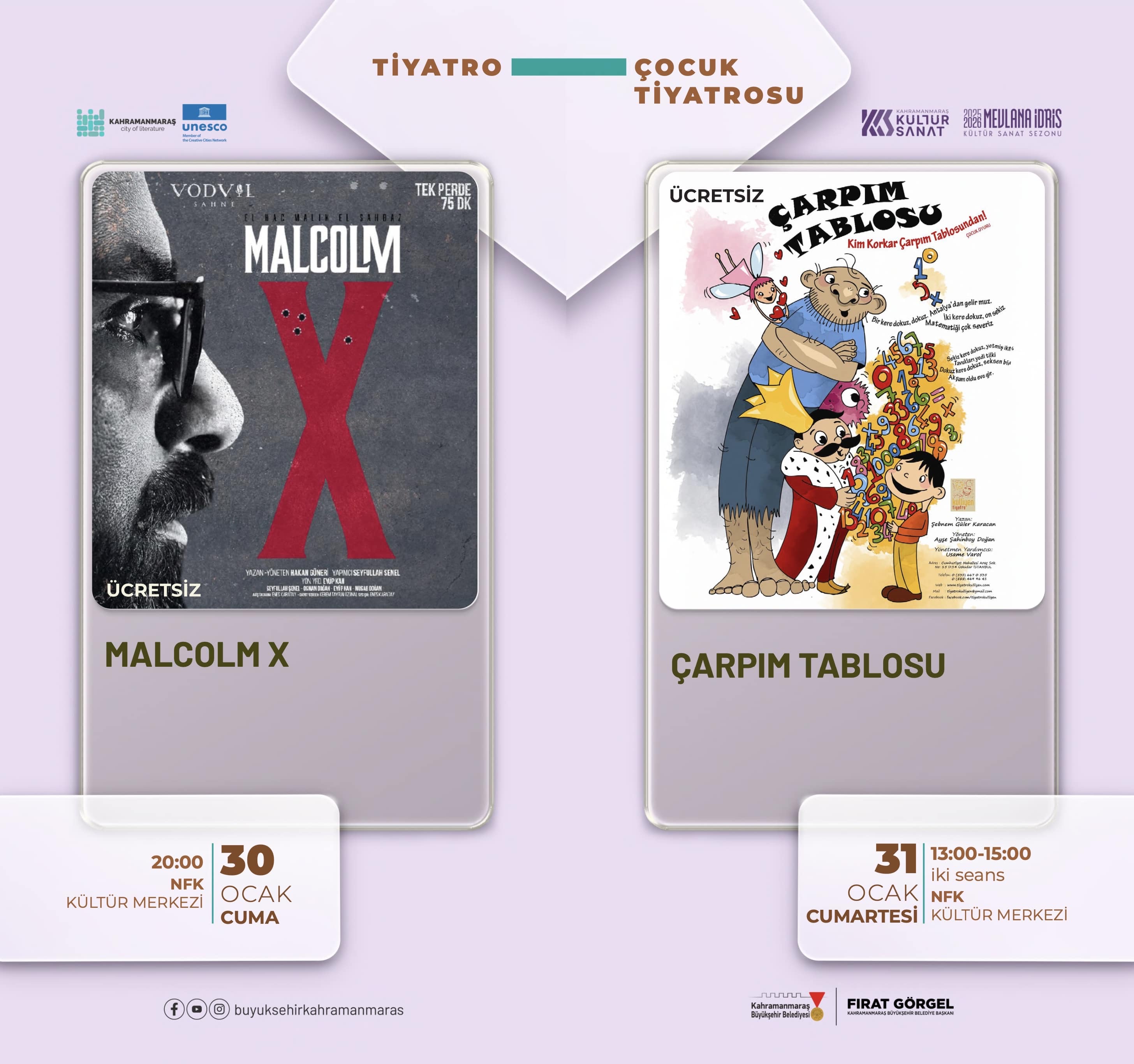 25 Ocak Pazar “Deliriyorum Haberin Olsun”, 30 Ocak Cuma ise “Malcolm X” adlı tiyatro oyunları izleyiciyle buluşacak.