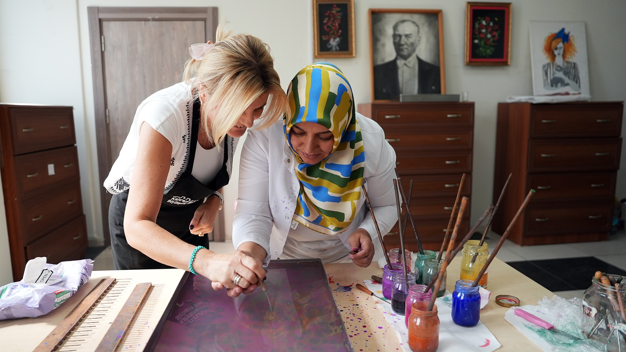 Kahramanmaraş Büyükşehir Belediyesinin Meslek Edindirme Kursları (KAMEK), uluslararası bir ziyarete ev sahipliği yaptı. Erasmus programı kapsamında İtalya, Letonya ve Polonya’dan Kahramanmaraş’a gelen öğrenciler, KAMEK bünyesinde düzenlenen kursları yakından görme ve deneyimleme fırsatı buldu. Ziyaret kapsamında KAMEK’teyürütülen eğitimler hakkında bilgi alan öğrenciler, özellikle ebru ve süs eşyası yapım atölyelerinde uygulamalı çalışmalar gerçekleştirdi. Ortaya çıkan renkli görüntüler, öğrencilerin hem eğlenmesini hem de Türk kültürüne dair yeni deneyimler kazanmasını sağladı.