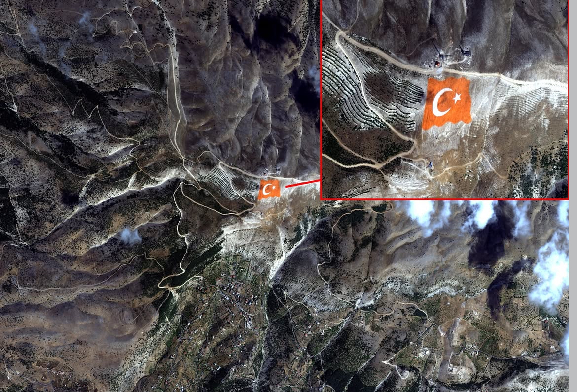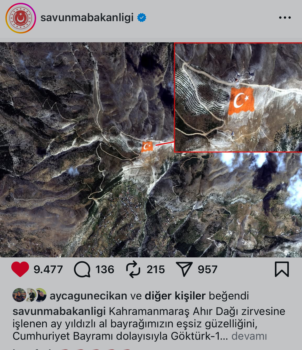 “ Kahramanmaraş Ahır Dağı zirvesine işlenen ay yıldızlı al bayrağımızın eşsiz güzelliğini, Cumhuriyet Bayramı dolayısıyla Göktürk-1 uydumuz ile uzaydan görüntüledik.