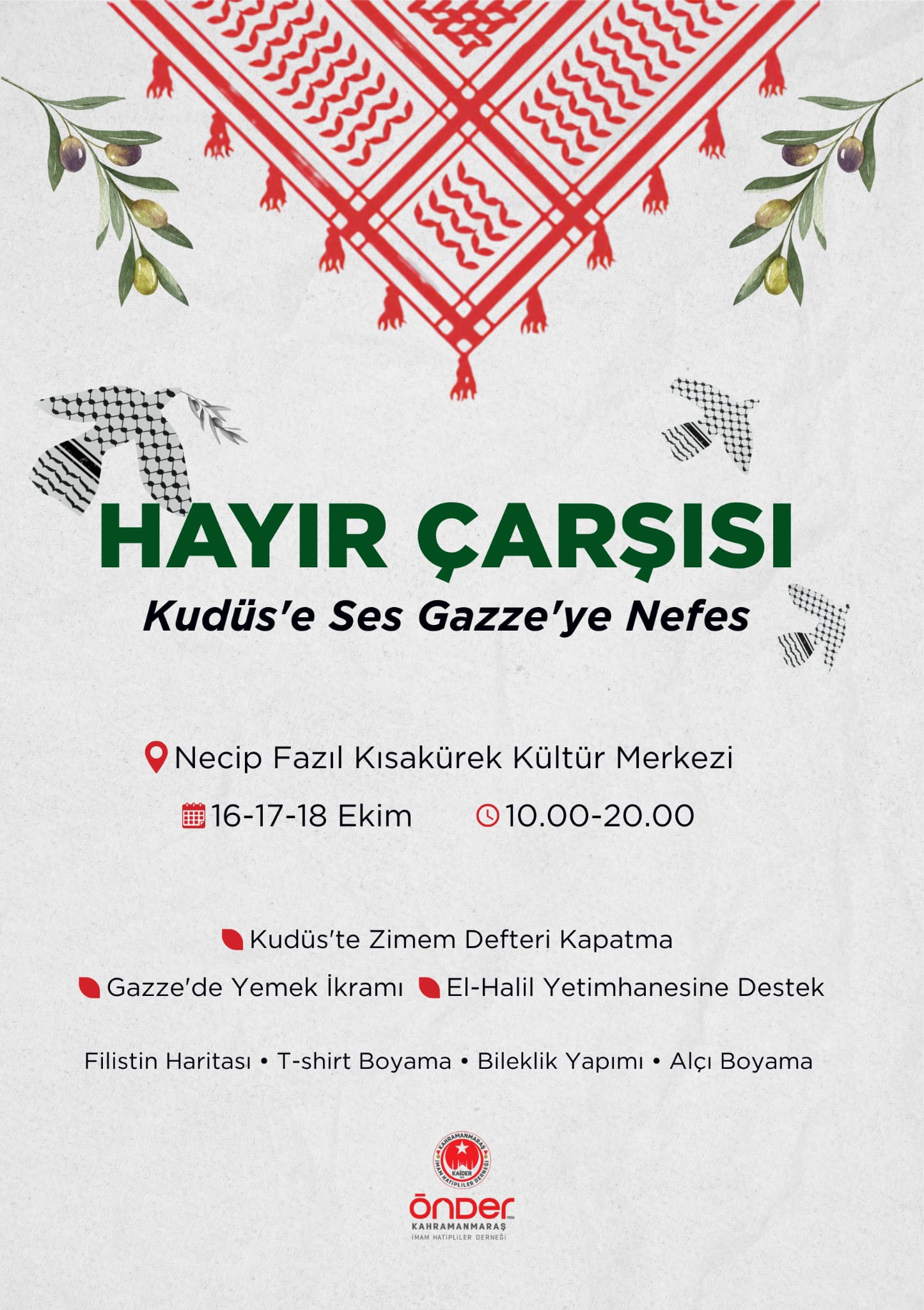 “Hayır Çarşısı: Kudüs’e Ses, Gazze’ye Nefes” temalı yardım organizasyonu, 16-17-18 Ekim tarihleri arasında Necip Fazıl Kısakürek Kültür Merkezi’nde düzenlenecek.