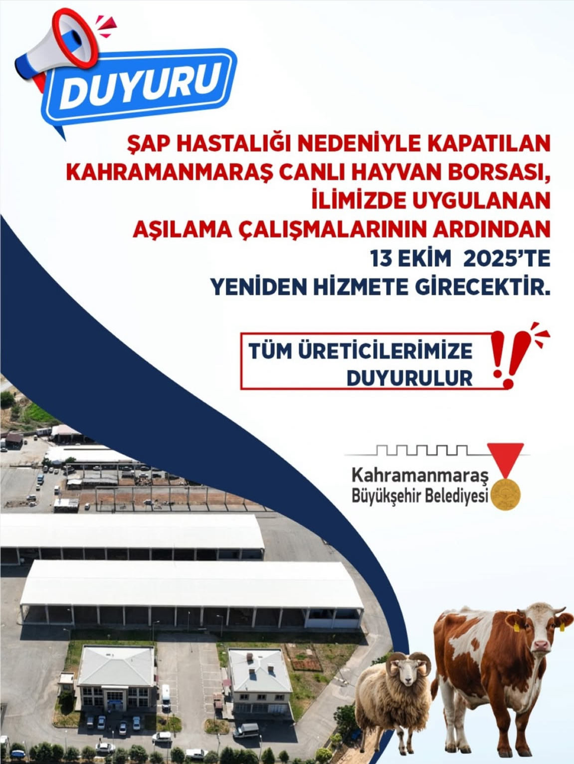 Şap hastalığı nedeniyle bir süredir kapalı olan Kahramanmaraş Canlı Hayvan Borsası, il genelinde gerçekleştirilen aşılama çalışmalarının tamamlanmasının ardından 13 Ekim 2025 Pazartesi günü yeniden hizmete giriyor.