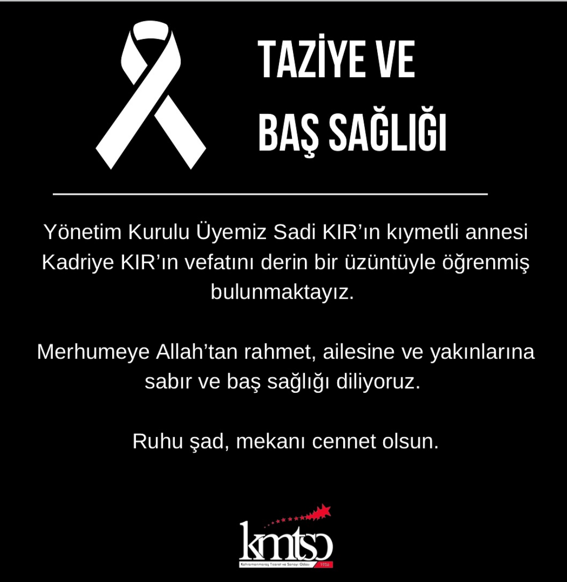 Kahramanmaraş Ticaret ve Sanayi Odası (KMTSO) Yönetim Kurulu Başkanı Mustafa Buluntu, Yönetim Kurulu Üyesi Sadi Kır’ın annesi Kadriye Kır’ın vefatı dolayısıyla bir taziye mesajı yayımladı.