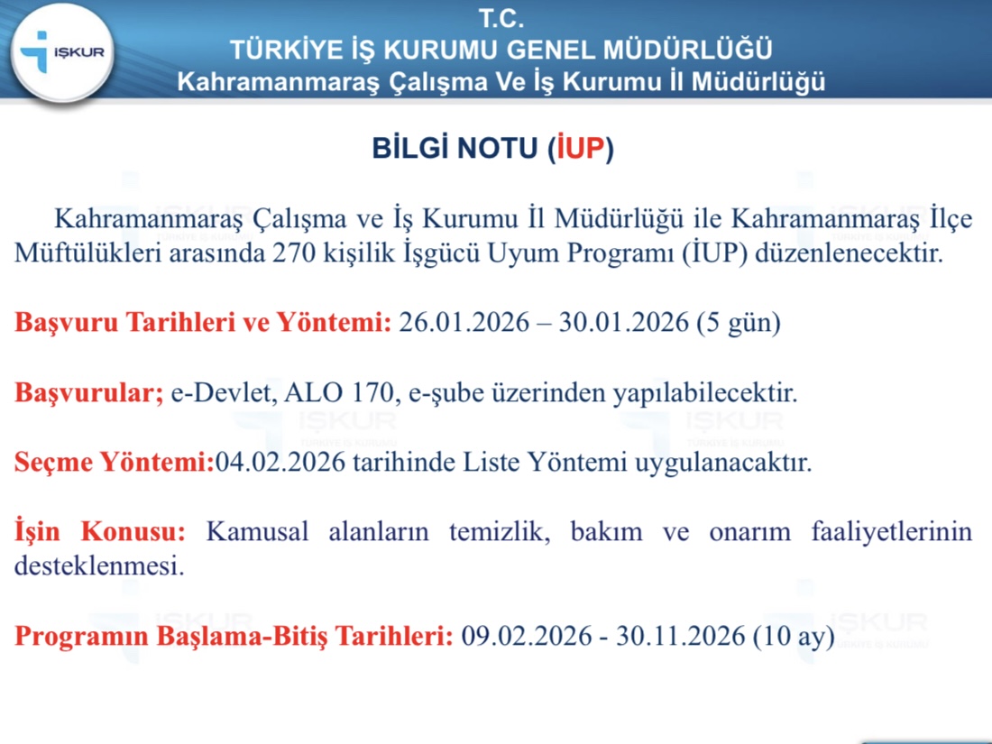 İşgücü Uyum Programı, 9 Şubat 2026 – 30 Kasım 2026 tarihleri arasında, yaklaşık 10 ay süreyle yürütülecek.