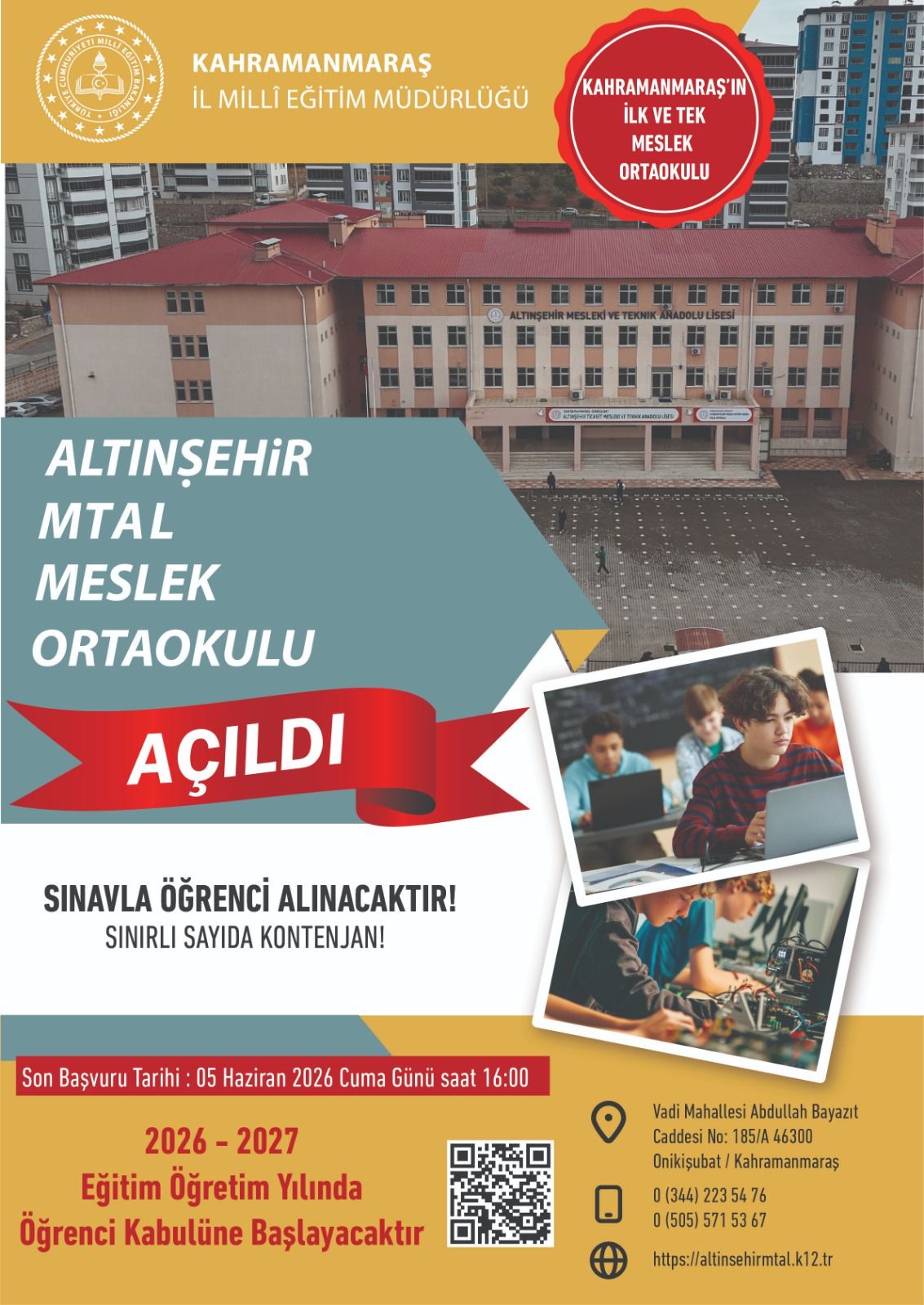 Kahramanmaraş’ta mesleki ve teknik eğitimin güçlendirilmesine yönelik önemli bir adım daha atılıyor. Onikişubat ilçesinde bulunan Altınşehir Mesleki ve Teknik Anadolu Lisesi bünyesinde açılması planlanan Mesleki Ortaokulu için hazırlıklar tamamlandı.