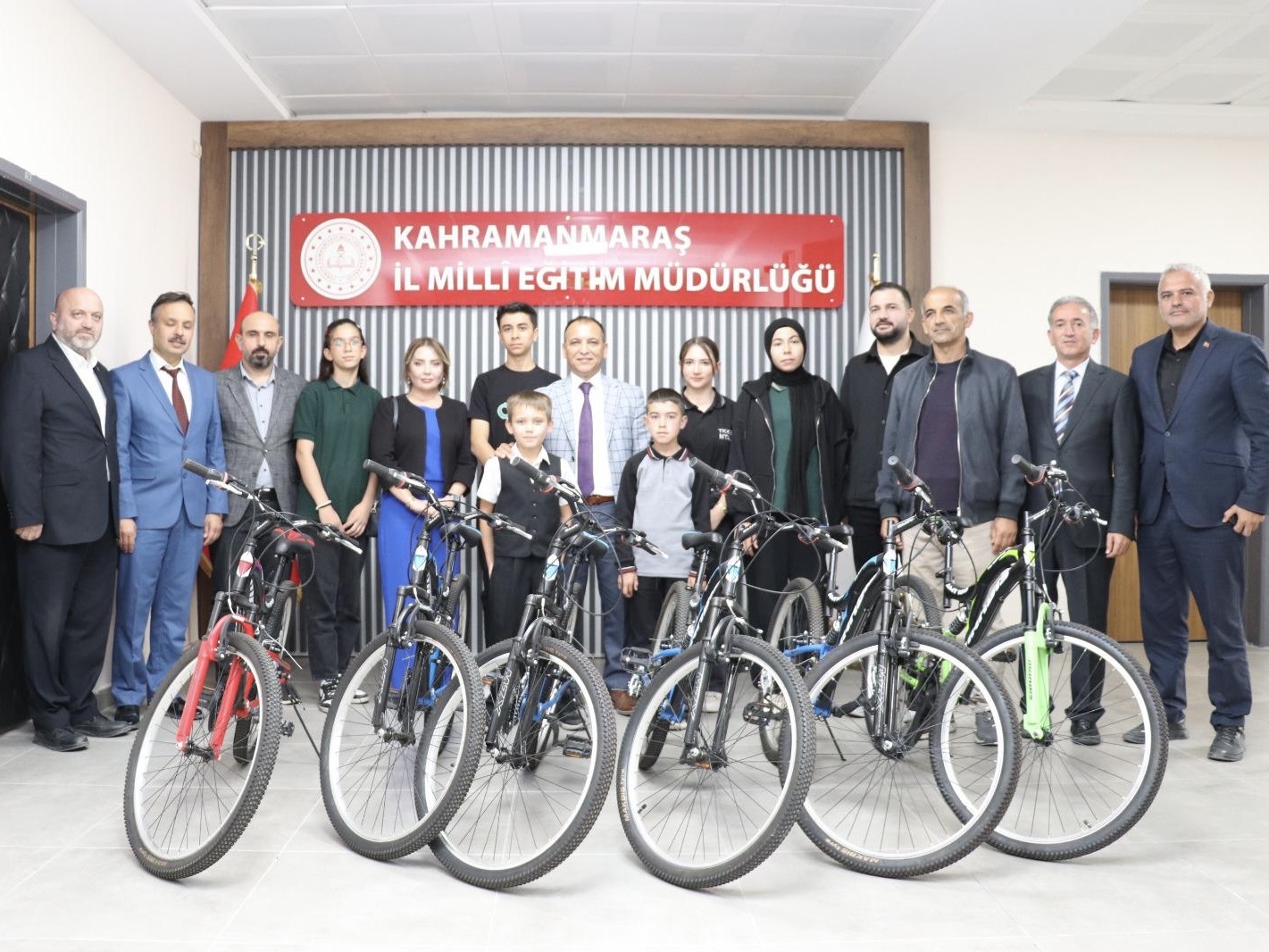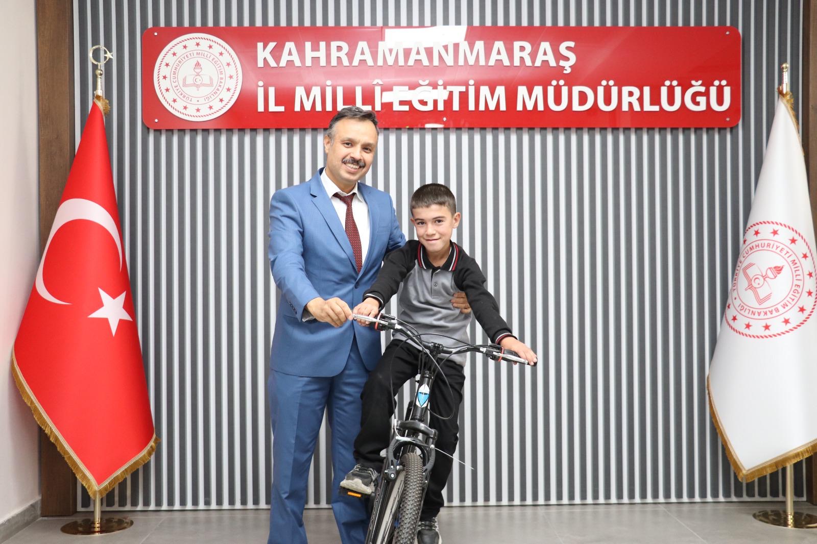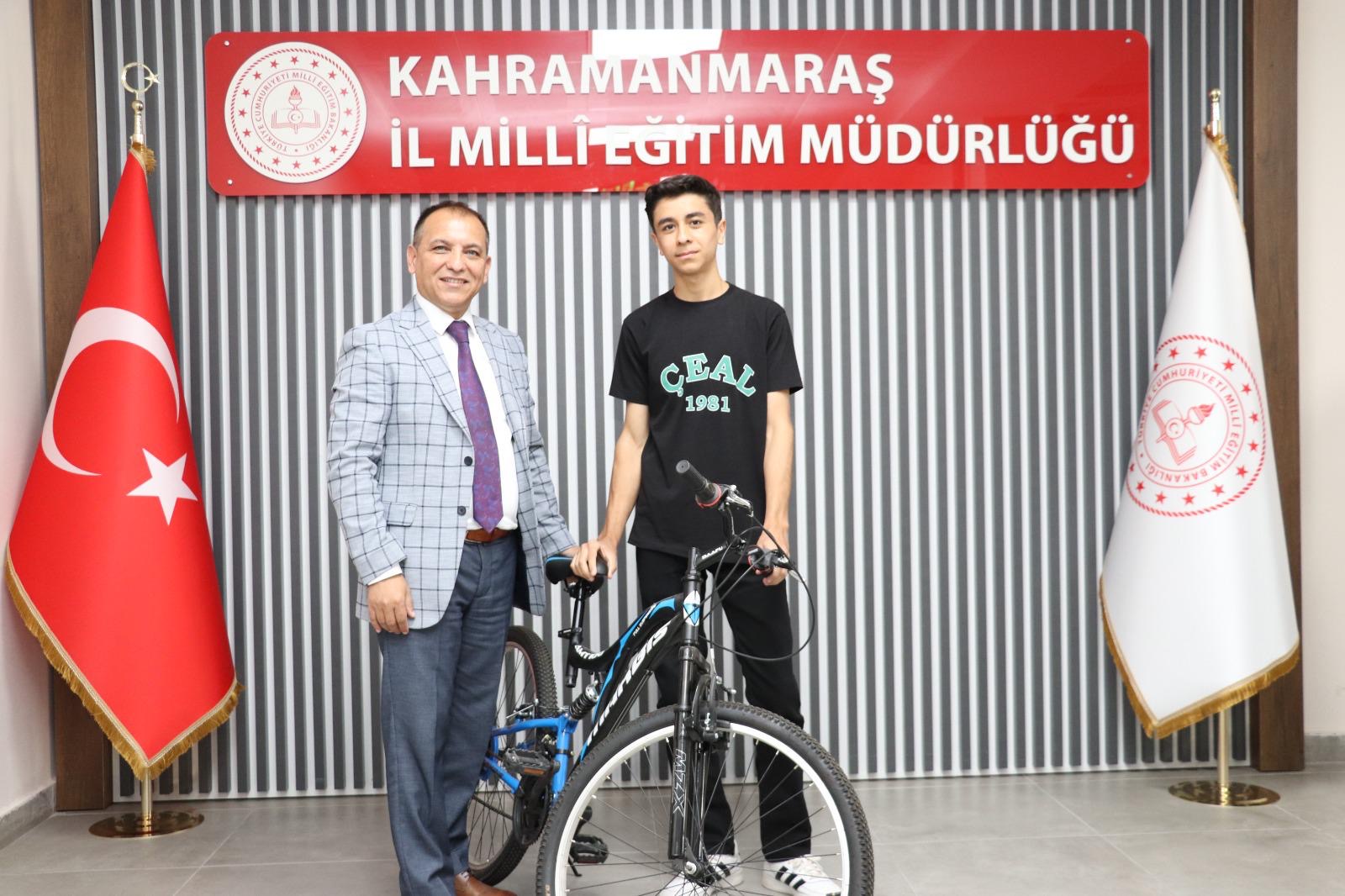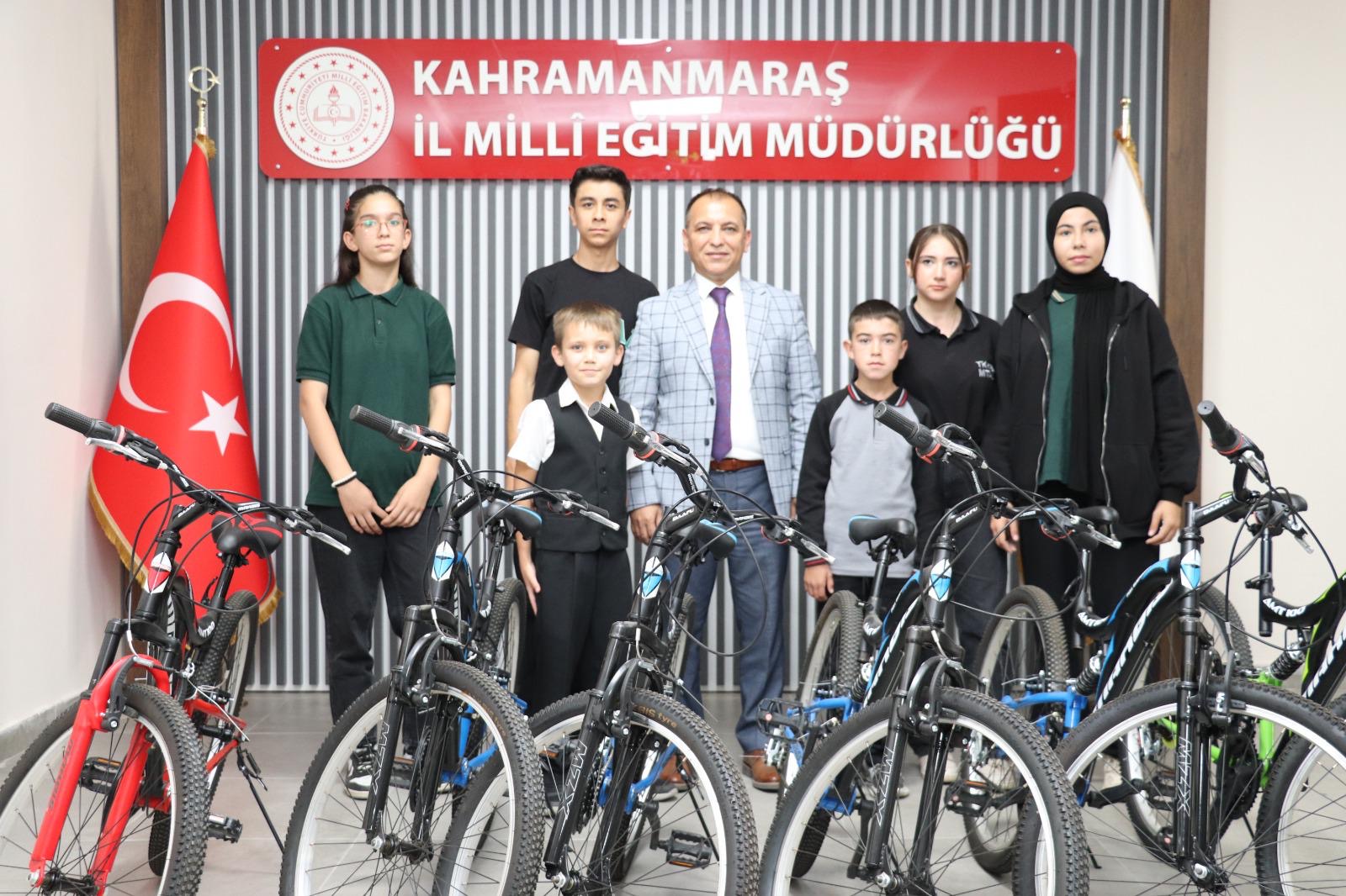 Kazanan öğrenciler, bisiklet ödüllerini İl Millî Eğitim Müdürü Erhan Baydur’un elinden aldı.