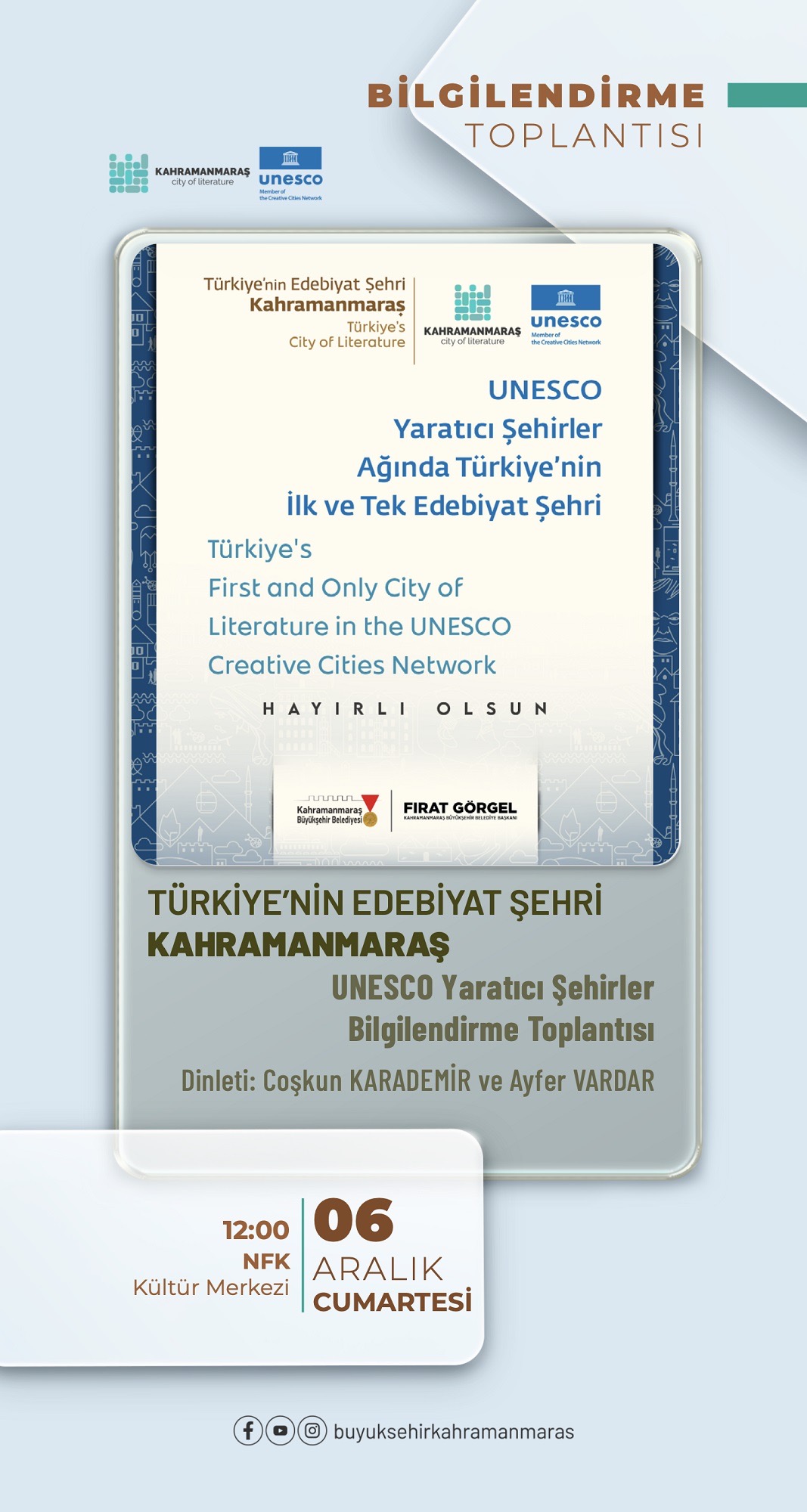 Büyükşehir Belediyesinin Aralık Kültür Sanat Sezonu kapsamında 6 Aralık Cumartesi günü saat 12.00’da NFK Kültür Merkezi’nde UNESCO Yaratıcı Şehirler Ağı Bilgilendirme Toplantısı gerçekleştirilecek. Toplantıda Türkiye’den bu alanda seçilen ilk şehir olan Kahramanmaraş’ın başarısı konuşulacak.
