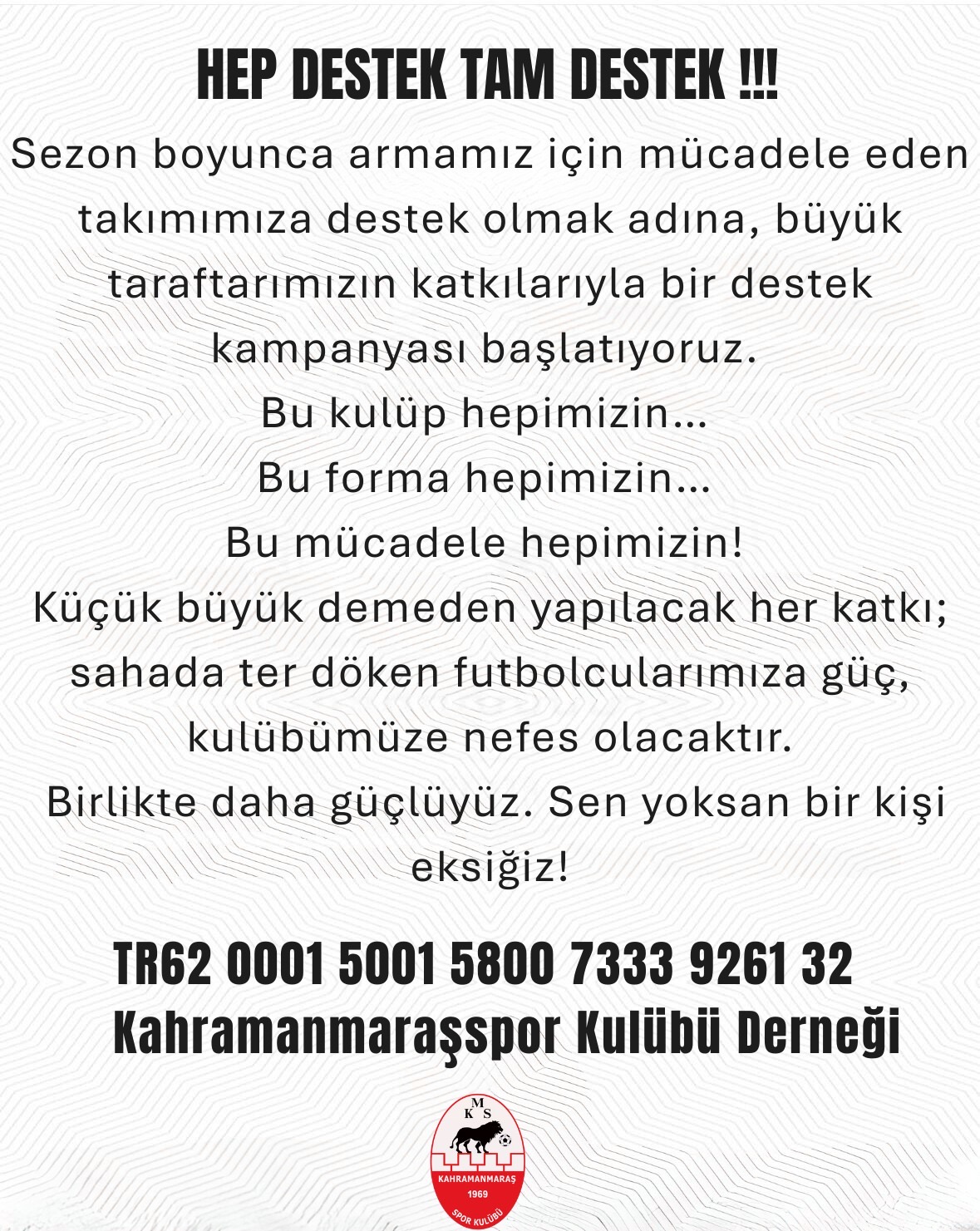 “Bu kulüp 1969’dan bu yana Kahramanmaraş’ı temsil ediyor. Geçmişte olduğu gibi bugün de aynı bayrağı dalgalandırmak için mücadele ediyoruz. Kiminin maddi desteği, kiminin duası olur. Her katkının ayrı bir değeri var.”