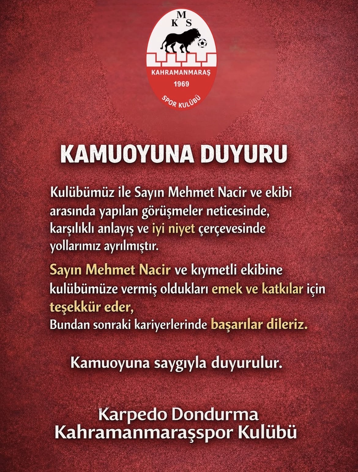 “Kulübümüz ile Sayın Mehmet Nacir ve ekibi arasında yapılan görüşmeler neticesinde, karşılıklı anlayış ve iyi niyet çerçevesinde yollarımız ayrılmıştır. Sayın Mehmet Nacir ve kıymetli ekibine kulübümüze vermiş oldukları emek ve katkılar için teşekkür eder, bundan sonraki kariyerlerinde başarılar dileriz.”