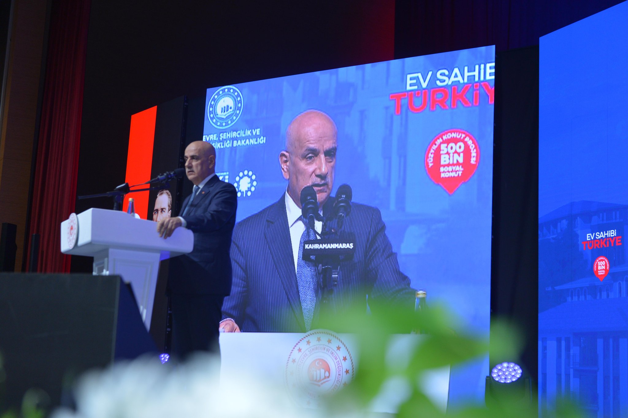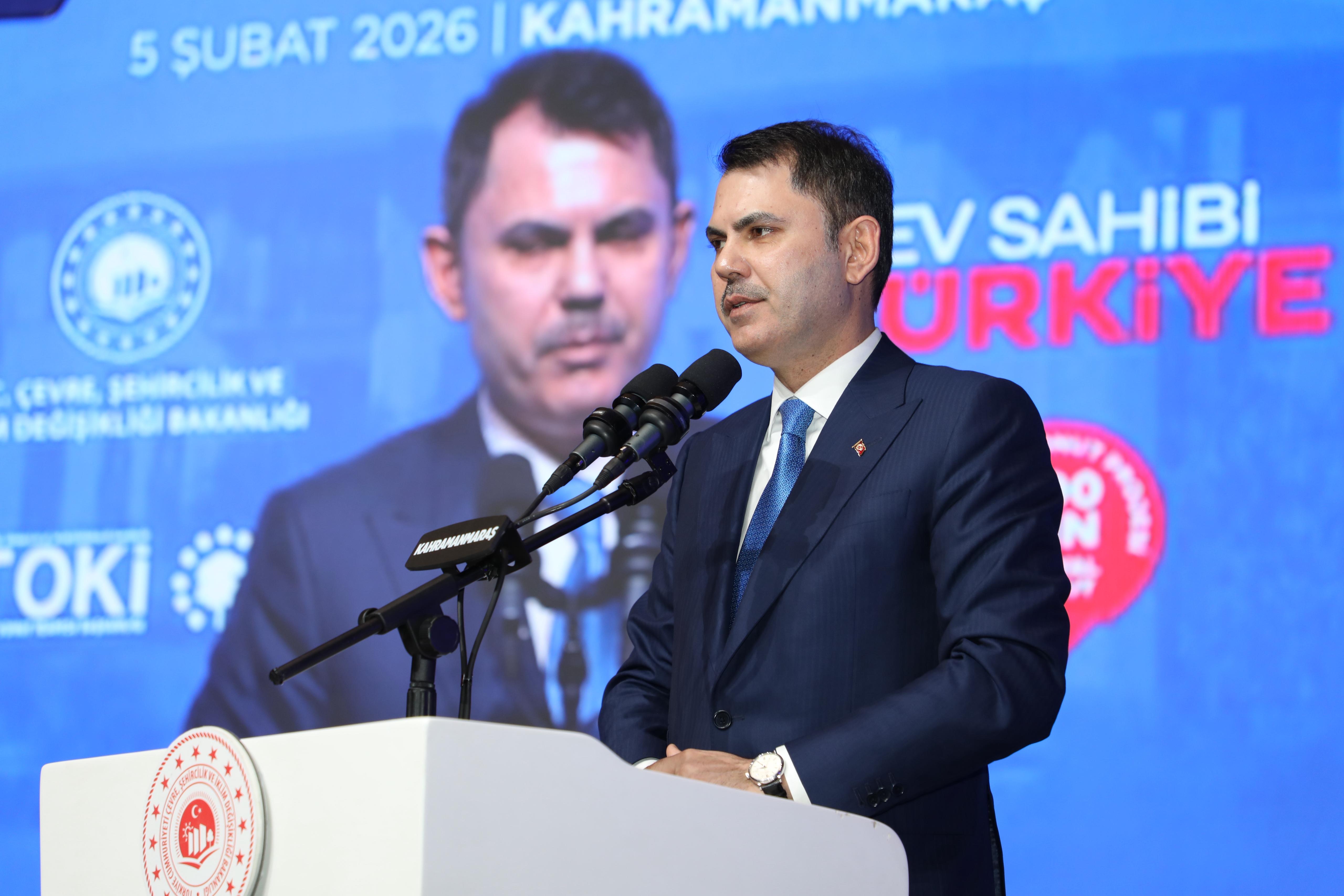Törende konuşan Çevre, Şehircilik ve İklim Değişikliği Bakanı Murat Kurum, deprem bölgesinde yürütülen çalışmaların dünya ölçeğinde bir başarı olduğunu vurguladı.Bakan Kurum, “Depremin ardından vatandaşlarımıza ‘yuvasına kavuşmayan tek bir kişi kalmayacak’ diye söz verdik. Milletimizle omuz omuza, asrın dayanışmasıyla asrın inşasını gerçekleştirdik. 200 bin mimar, mühendis ve işçimizle gece gündüz çalışarak saatte 23, günde 550 konut ürettik. 110 bin kilometrekarelik bir alanı iki yıl gibi kısa sürede yeniden ayağa kaldırdık. Parklarıyla, meydanlarıyla, okullarıyla, camileriyle birlikte yeni şehirler kurduk” dedi. Kahramanmaraş özelinde bugüne kadar 73 bin bağımsız bölümün teslim edildiğini hatırlatan Kurum, tarihi yapılarınyeniden canlandırıldığını ve yeni stadyumun da kısa sürede hizmete alınacağını söyledi.