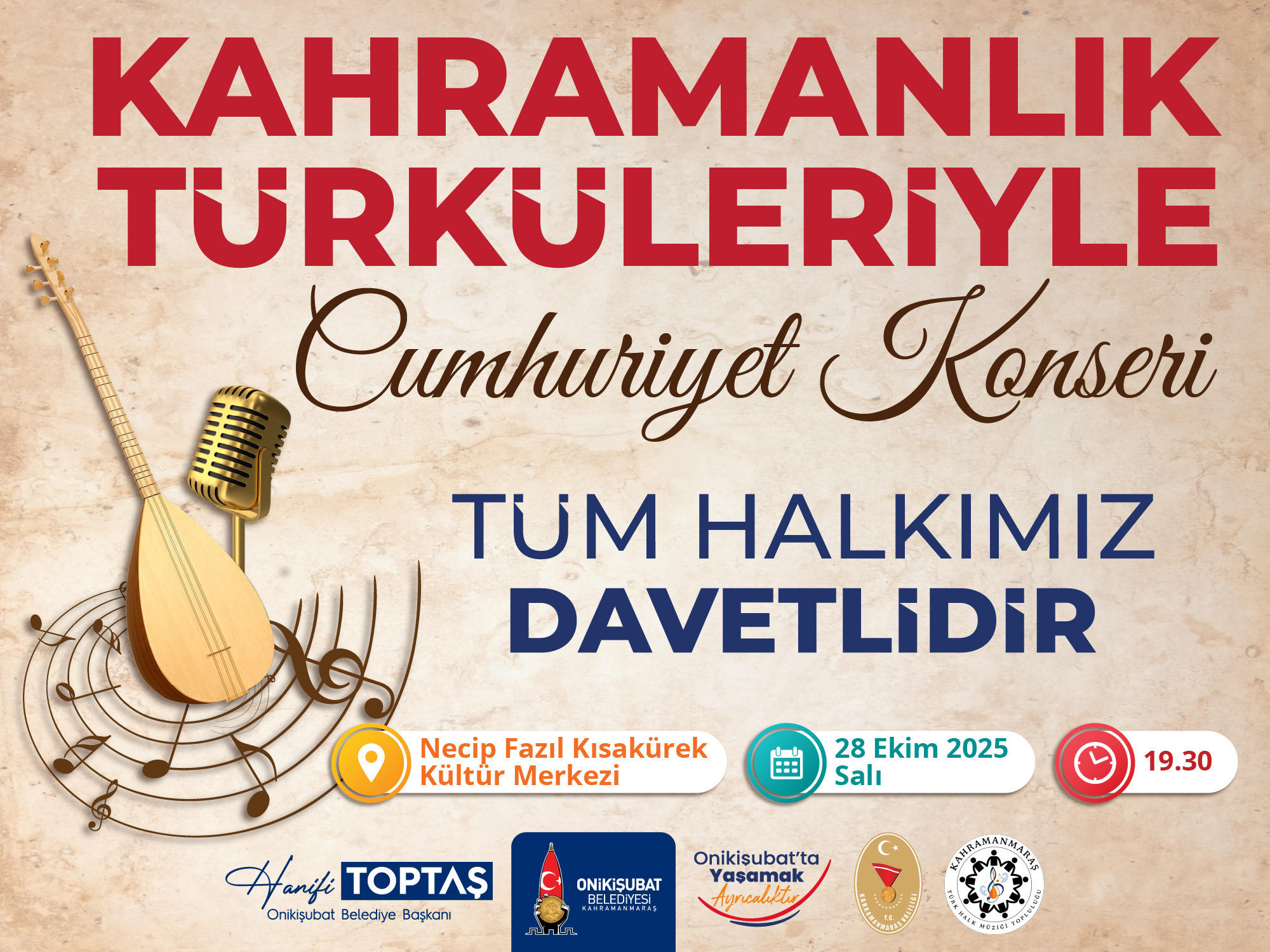 Türkiye Cumhuriyeti’nin 102’nci kuruluş yıl dönümü, Onikişubat Belediyesi’nin düzenleyeceği anlamlı bir konserle kutlanacak. “Kahramanlık Türküleriyle Cumhuriyet Konseri” adıyla gerçekleştirilecek etkinlik, kahramanlık destanlarımızı anlatan ezgilerle vatandaşlara unutulmaz bir gece yaşatacak.
