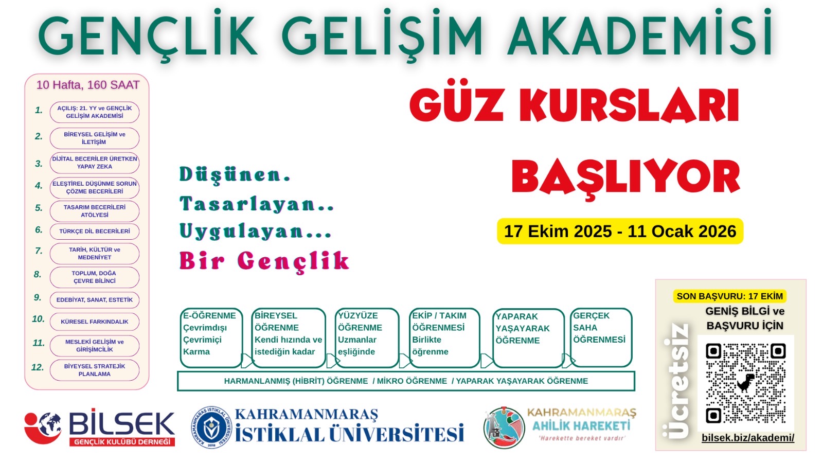 Kahramanmaraş’ta gençlerin kişisel, sosyal ve mesleki gelişimlerine katkı sunmayı hedefleyen Gençlik Gelişim Akademisi, 17 Ekim 2025 Cuma akşamı düzenlenen törenle kapılarını açtı. BİLSEK Gençlik Kulübü Derneği, Kahramanmaraş İstiklal Üniversitesi ve Ahilik Hareketi Derneği iş birliğiyle hayata geçirilen akademi, on hafta boyunca gençlere bilgi, beceri ve vizyon kazandıracak kapsamlı bir eğitim süreci sunacak.