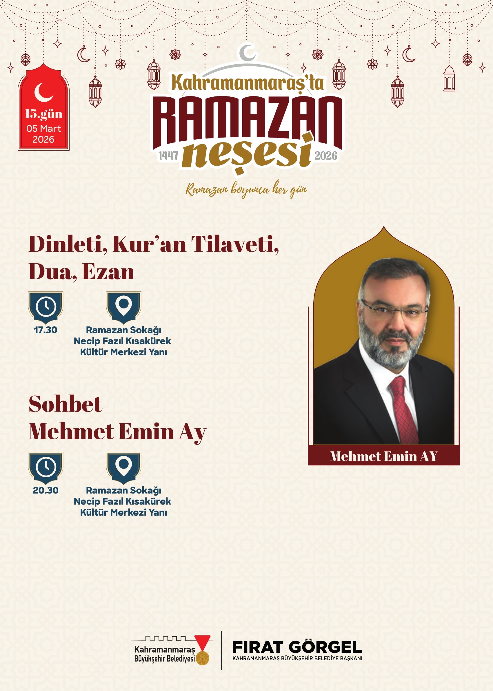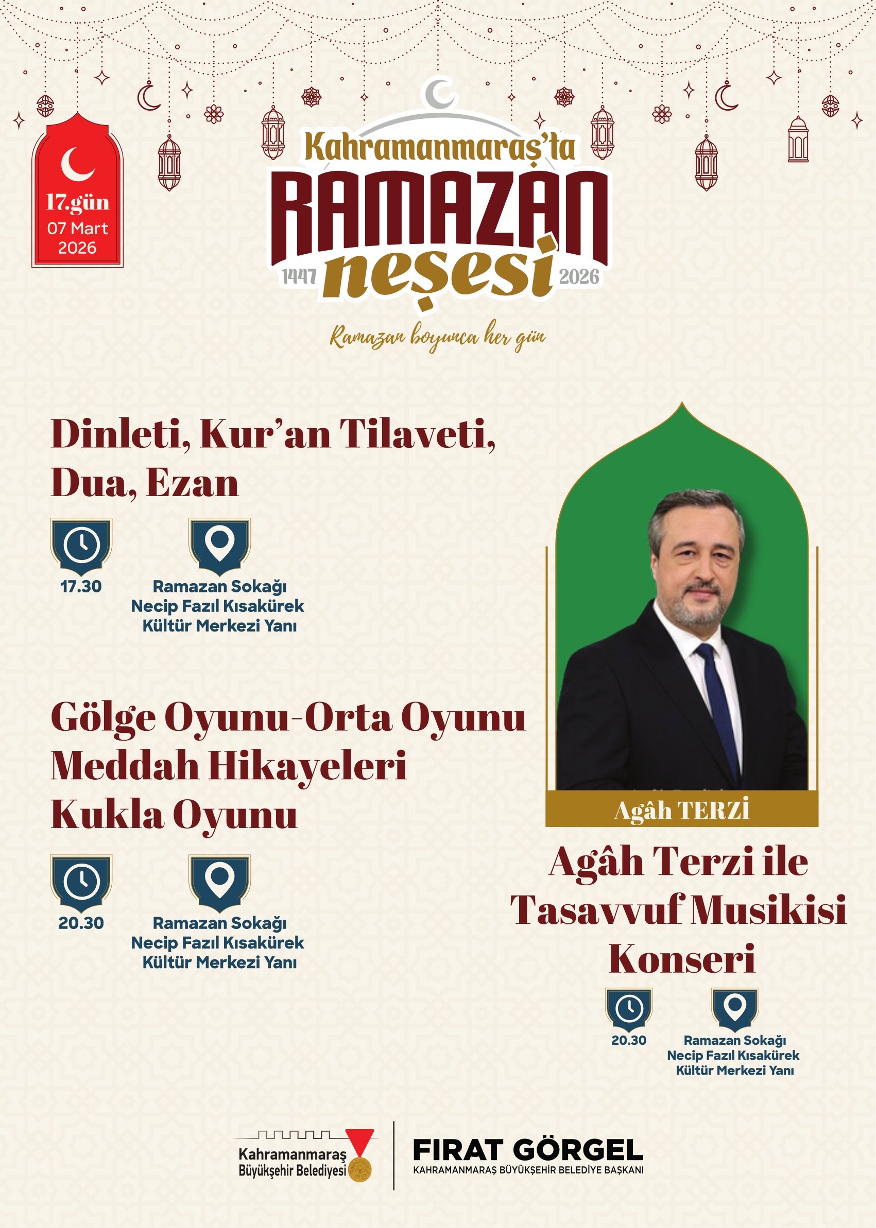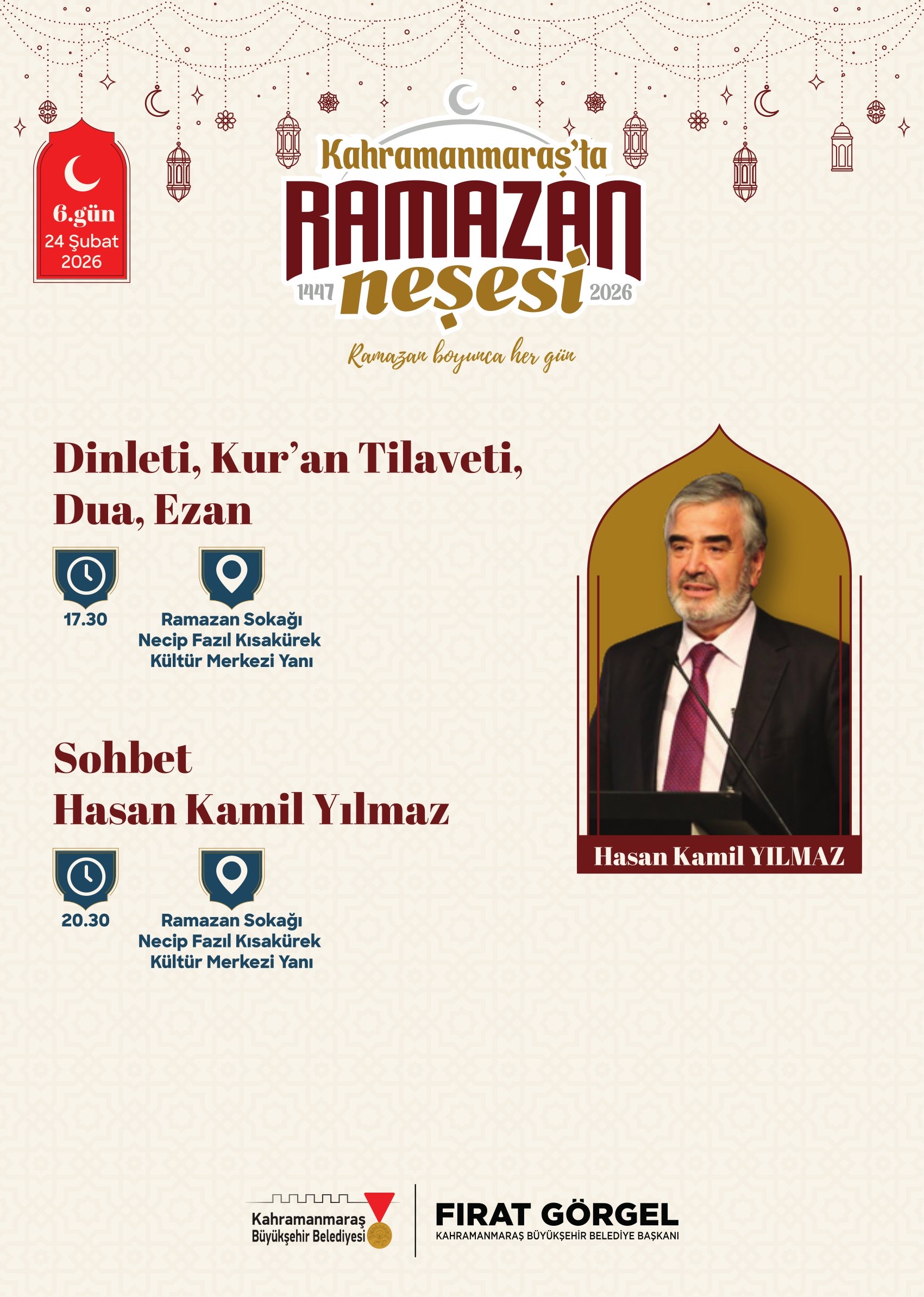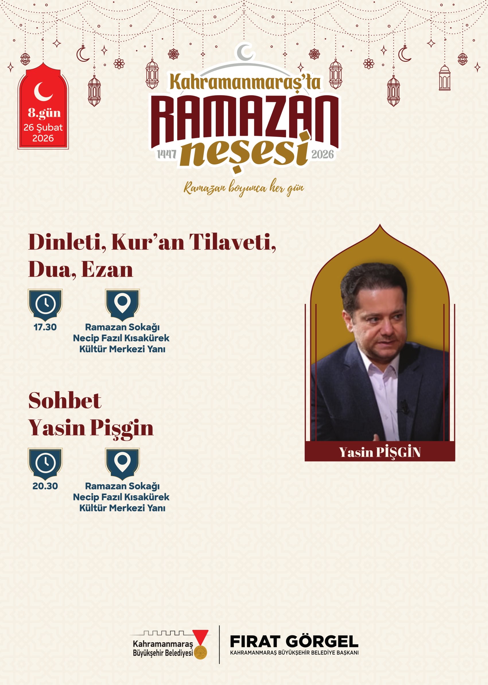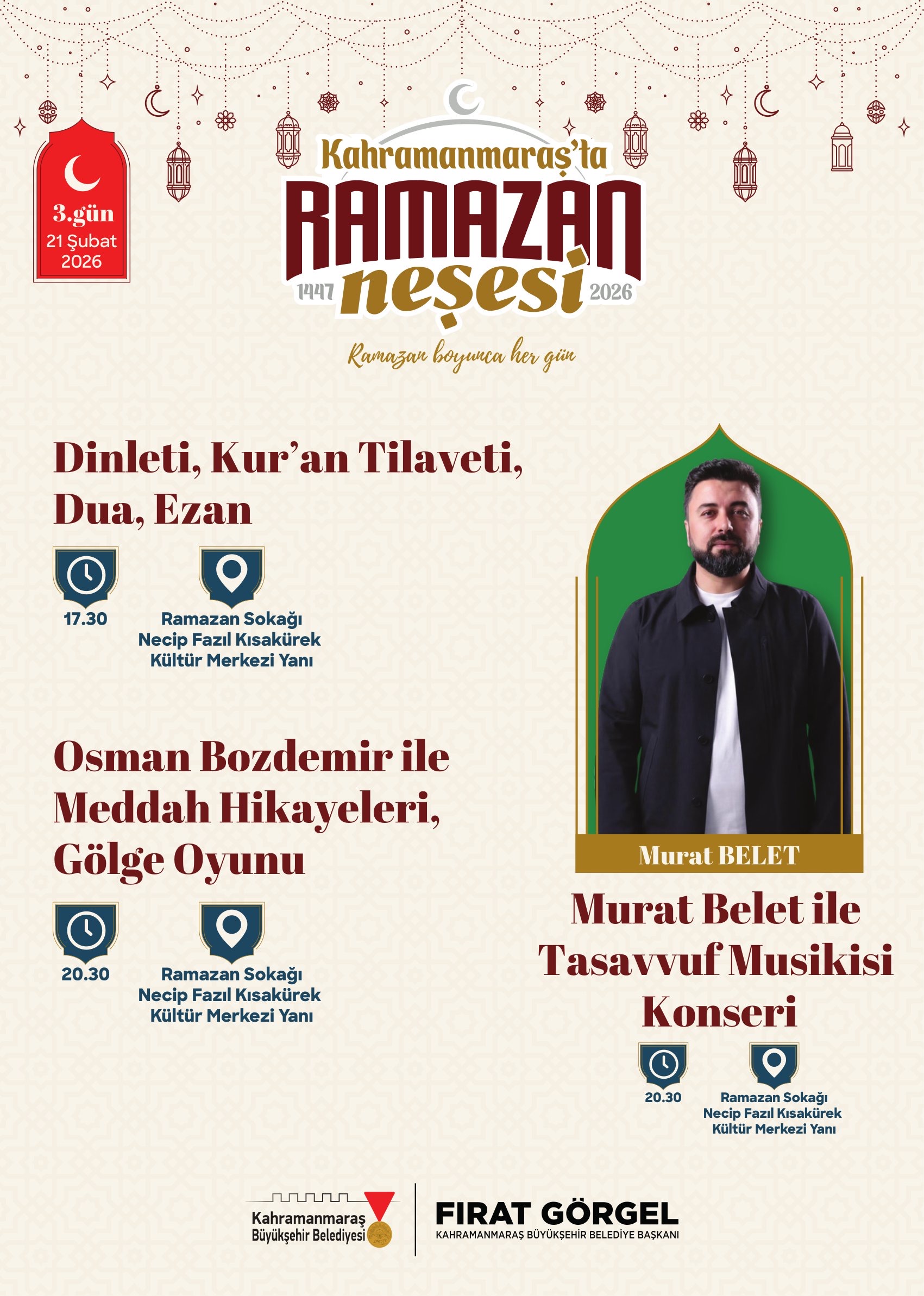 Ramazan etkinlikleri kapsamında birbirinden değerli isimler Ramazan Sokağı’nda Kahramanmaraşlılarla buluşacak. 21 Şubat Cumartesi günü tasavvuf musikisinin sevilen ismi Mustafa Belet sahne alacak. 24 Şubat Salı günü ilahiyatçı ve akademisyen Hasan Kâmil Yılmaz, Ramazan’ın manevi boyutunu ele alan sohbet programıyla vatandaşlarla buluşacak.26 Şubat Perşembe günü yazar Yasin Pişgin söyleşisiyle gönüllere dokunacak. 1 Mart Pazar günü sanatçı Mustafa Cihat, tasavvuf musiki konseriyle Ramazan gecesine anlam katacak. 3 Mart Salı günü akademisyen yazar Ömer Demirbağ, sohbet programıyla katılımcılarla bir araya gelecek.5 Mart Perşembe günü ilahiyatçı Mehmet Emin Ay,Ramazan’ın manevi derinliğine dair konuşmasıyla programa konuk olacak. 7 Mart Cumartesi günü müzisyen Agah Terzi,tasavvuf musiki dinletisiyle sahne alacak. 8 Mart Pazar günü psikolog yazar Hatice Kübra Tongar aile, çocuk ve maneviyat temalı sohbetiyle vatandaşlarla buluşacak. 12 Mart Perşembe günü yazar Osman Egin, söyleşi programıyla Ramazan akşamına renk katacak. 17 Mart Salı günü ise şair ve akademisyen Nurullah Genç, sohbet programıyla Ramazan Sokağı’nın konuğu olacak.