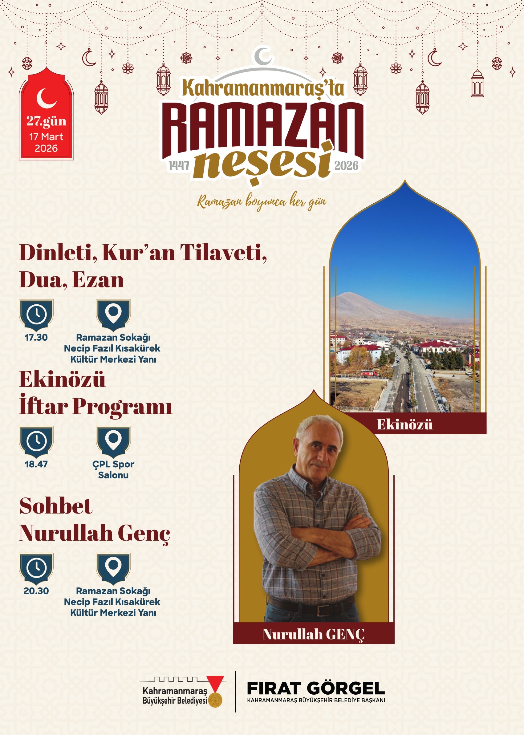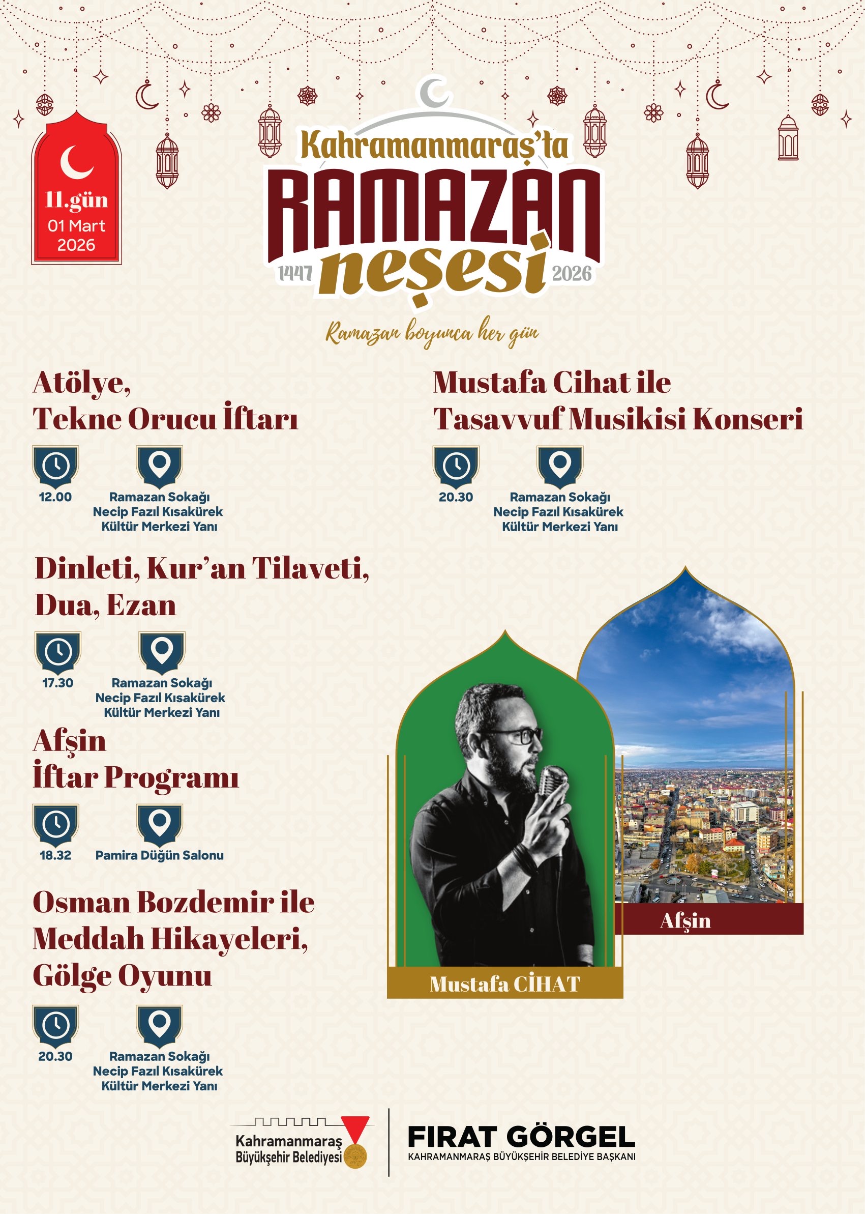 Ramazan ayının manevi iklimini şehir genelinde hissettirmek ve her yaştan vatandaşı kültür ile sanatla buluşturmak amacıyla Kahramanmaraş Büyükşehir Belediyesi, dolu dolubir etkinlik takvimi hazırladı. Ay boyunca çocuklardan yetişkinlere kadar geniş bir kesime hitap edecek programlarla Ramazan’ın huzuru; tiyatrodan söyleşiye, ilahi dinletilerinden atölye çalışmalarına kadar birçok başlık altında yaşatılacak.Etkinliklerin merkezi, Necip Fazıl Kısakürek Kültür Merkezi yanında oluşturulan Ramazan Sokağı olacak. Ramazan ayı boyunca her gün vatandaşların buluşma noktası haline gelecek alanda, manevi atmosferi güçlendiren programlar aralıksız devam edecek.
