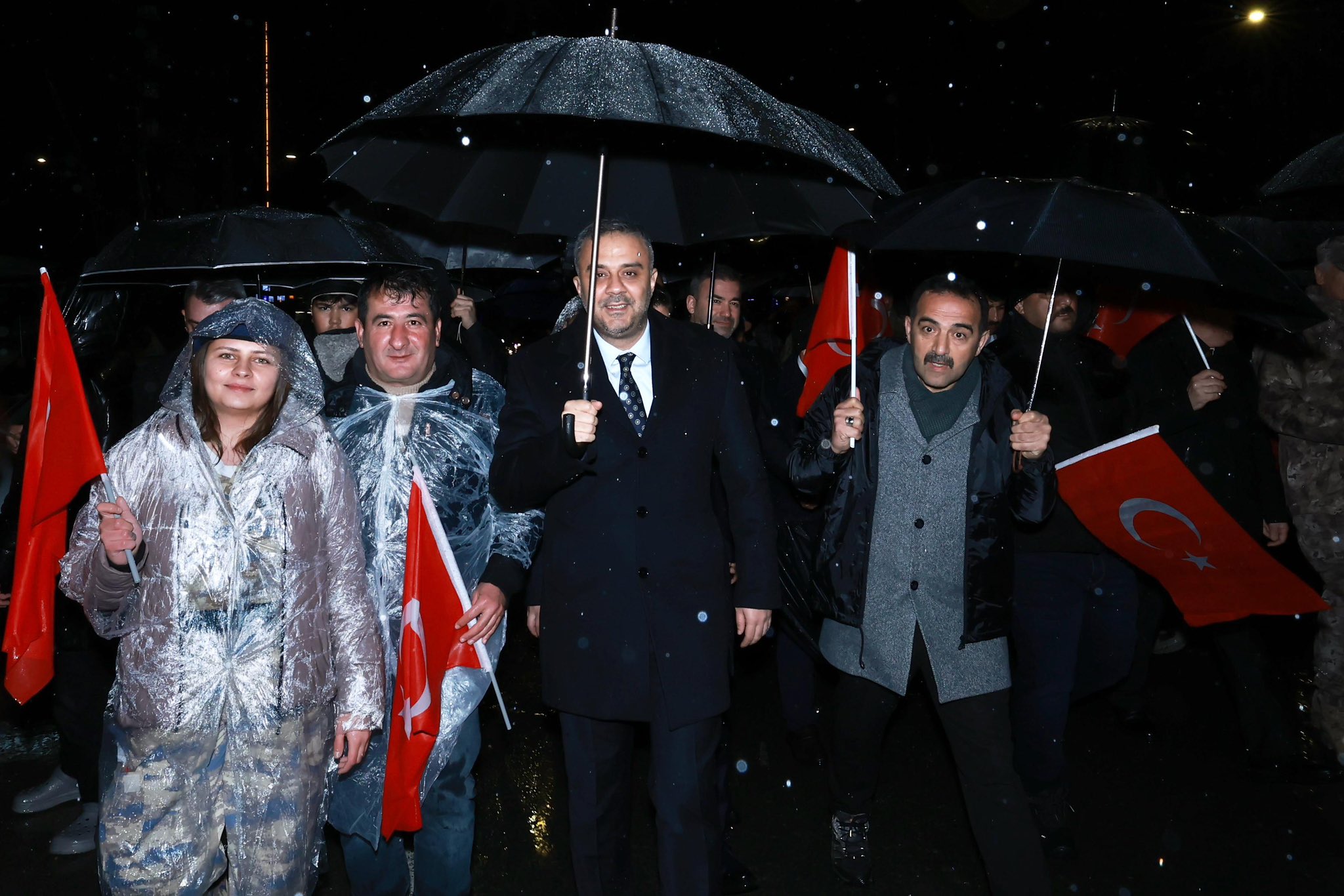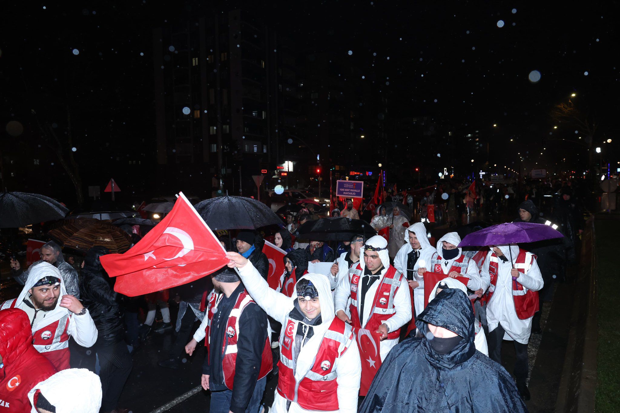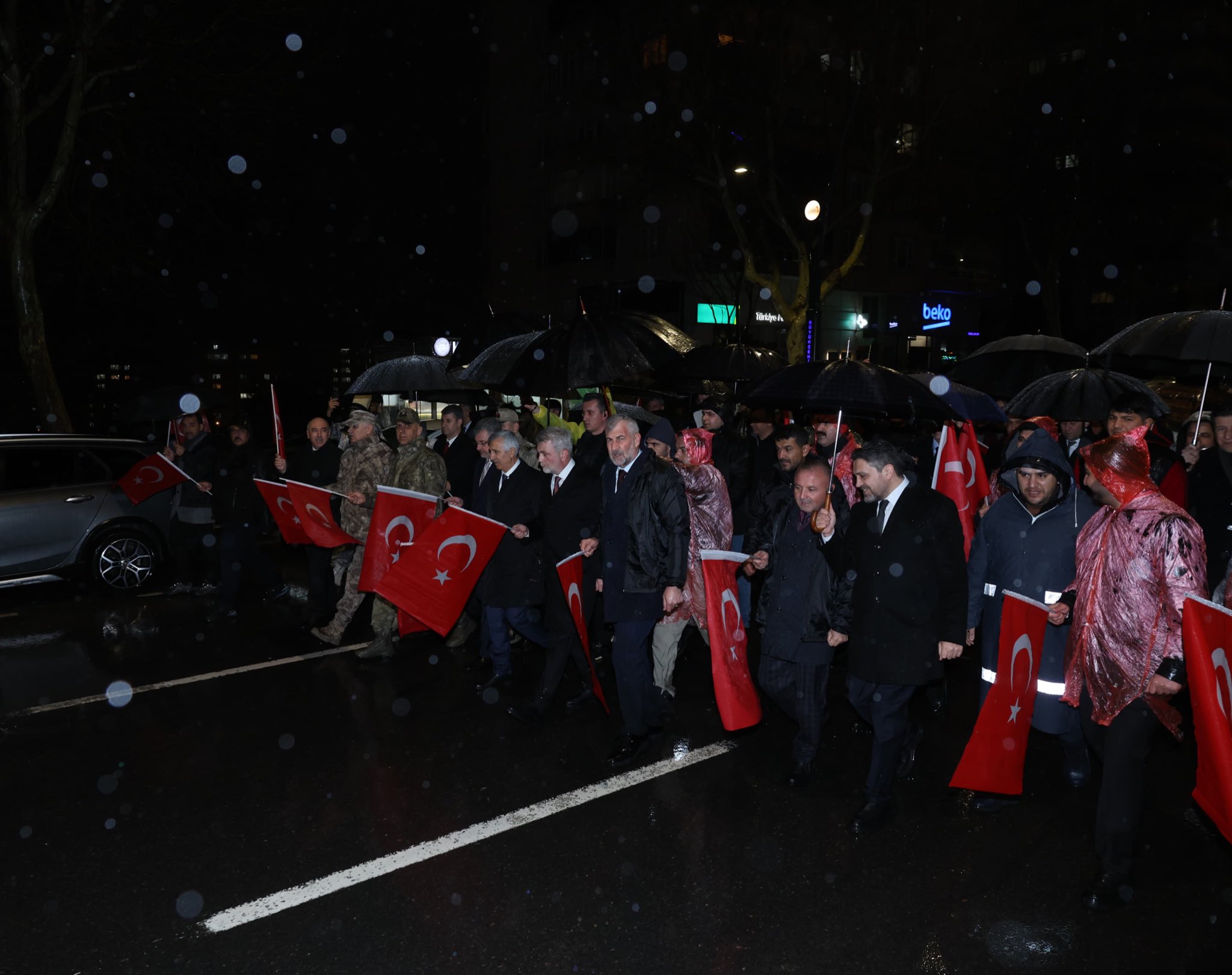 Kurtuluş Bayramı kapsamında Onikişubat Parkı’ndan başlayan kortej yürüyüşü, Necip Fazıl Kısakürek Kültür Merkezi önünde sona erdi. Soğuk hava ve aralıksız yağan yağmura rağmen yüzlerce vatandaş ellerinde Türk bayraklarıyla yürüyüşe katıldı.