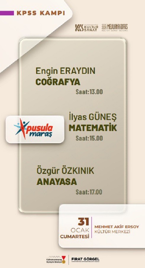 Kahramanmaraş Büyükşehir Belediyesi, gençlerin eğitim yolculuğuna katkı sunmak amacıyla Başkan Fırat Görgel’inöncülüğünde hayata geçirdiği Kamu Personeli Seçme Sınavı(KPSS) kampı, memur adayları ile buluşuyor. Öğrencilerin sınav hazırlık sürecine destek olmayı, eğitimde fırsat eşitliğini toplumun her kesimine yaymayı hedefleyen KPSS kampının ilki Coğrafya, Matematik ve Anayasa dersleri ile başlıyor. 31 Ocak Cumartesi günü Mehmet Akif Ersoy Kültür Merkezi’nde gerçekleştirilecek olan kampta saat 13.00’da Coğrafya dersinde Engin Eraydın, saat 15.00’da Matematik dersinde İlyas Güneş ve saat 17.00’da Anayasa dersinde Özgür Özkınık öğrencilerle buluşacak. Alanında deneyimli eğitmenler, öğrencilere sınavlarda başarıyı artıracak pratik yöntemler sunacak. Öğrenciler ise sınav stratejileri ve zaman yönetimi üzerine gerekli olan planlama becerilerini kazanma fırsatı bulacak. Kahramanmaraş Büyükşehir Belediyesinden yapılan açıklamada, tamamen ücretsiz olarak gerçekleştirilecek KPSS kamplarına, sınavlara hazırlanan tüm gençlerin davetli olduğu belirtildi.