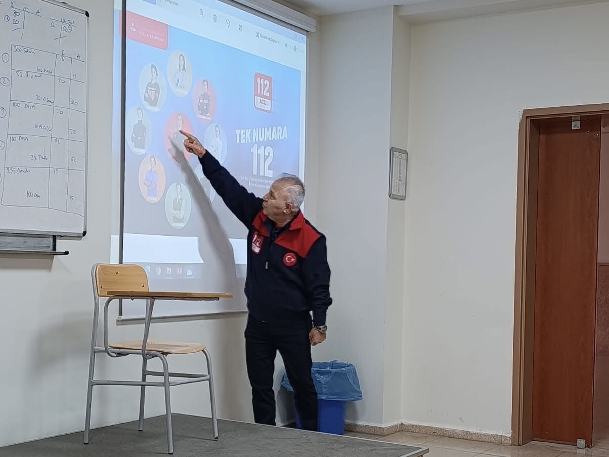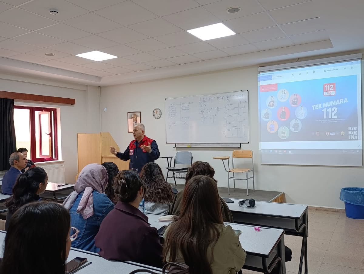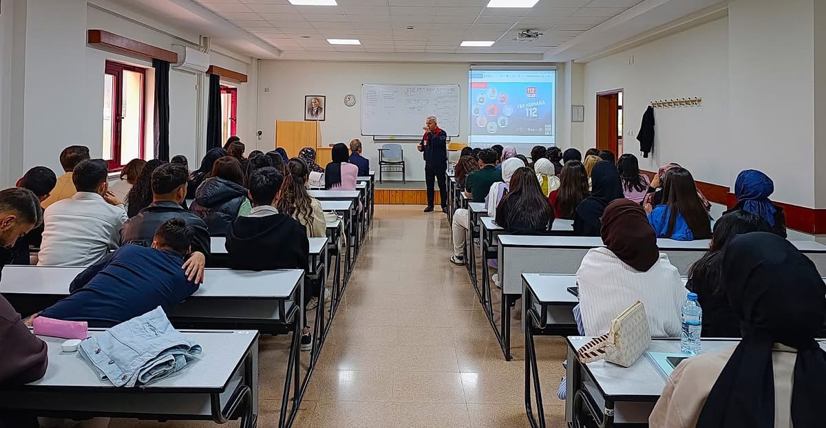 Salonun tamamen dolduğu etkinlikte öğrenciler, 112 Acil Çağrı Merkezi’nin işleyişi, kriz yönetimi ve liderlik süreçleri hakkında sorular yöneltti.