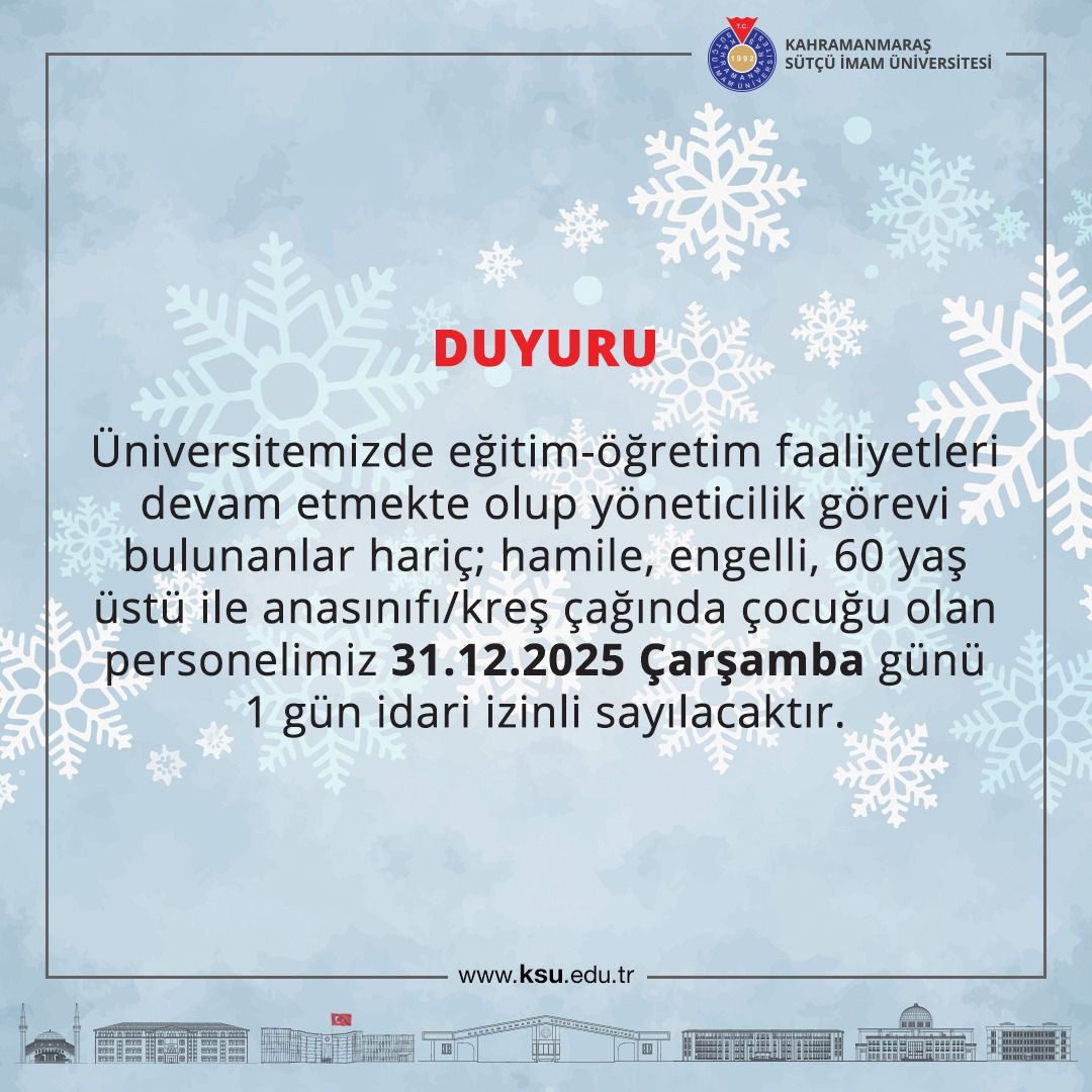 Öte yandan Kahramanmaraş Sütçü İmam Üniversitesi (KSÜ), aynı tarih için personeline yönelik idari izin uygulamasına ilişkin duyuru yayımladı.