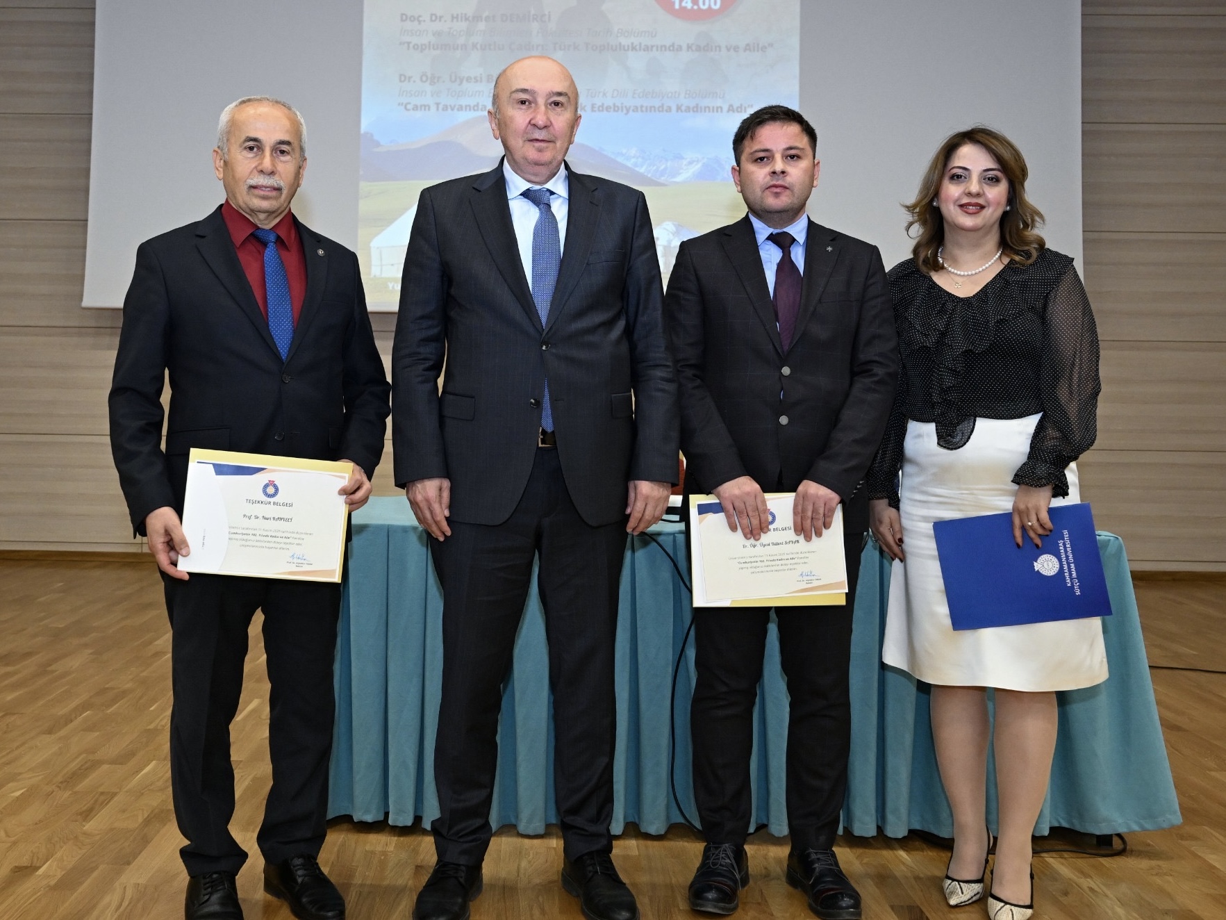 Panel oturumunda KSÜ İnsan ve Toplum Bilimleri Fakültesi Tarih Bölümü Öğretim Üyesi Doç. Dr. Hikmet Demirci, “Toplumun Kutlu Çadırı: Türk Topluluklarında Kadın ve Aile” başlıklı sunumunda, tarih boyunca kadının toplumsal yaşam ve aile içindeki rolünü ele aldı.