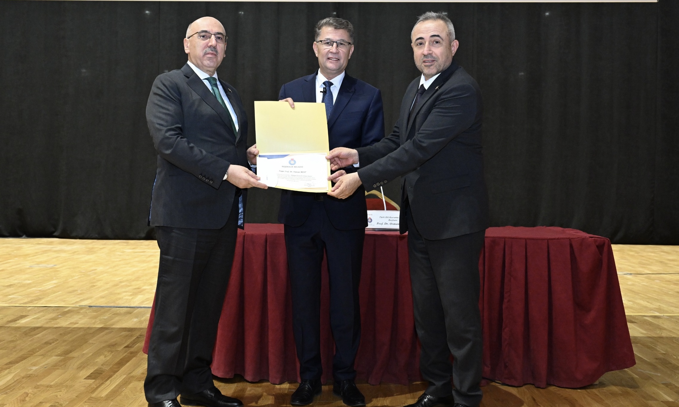 Programın sonunda Kahramanmaraş Milletvekili Dr. İrfan Karatutlu ve KSÜ Rektörü Prof. Dr. Mahmut Ak tarafından Türk Dil Kurumu Başkanı Prof. Dr. Osman Mert’e belge takdim edildi. Konferans, protokol üyeleri ve katılımcıların yer aldığı toplu fotoğraf çekimiyle sona erdi.