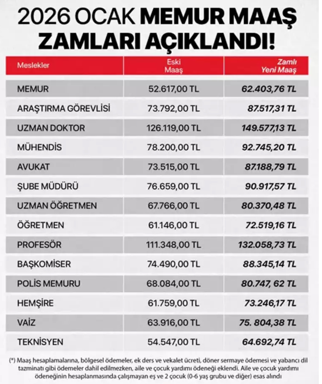 NOT: MEMURLARA TOPLU SÖZLEŞMEDE TABAN AYLIKLARINA VERİLEN 1.000 TL'LİK İLAVE ARTIŞ HESAPLARA DAHİL EDİLMEMİŞTİR.