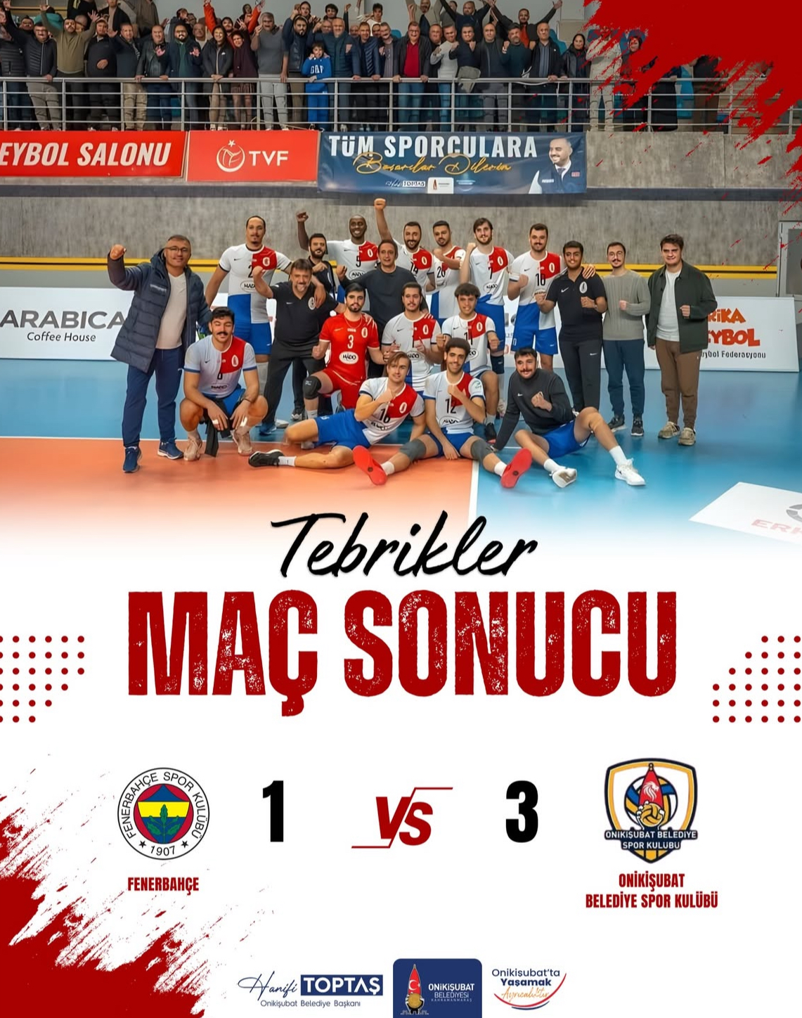 Arabica Coffee House Erkekler 1. Ligi’nde mücadele eden Onikişubat Belediyespor Voleybol Takımı, ligin güçlü ekiplerinden Fenerbahçe Medicana’yı deplasmanda 3–1 mağlup ederek haftanın en dikkat çeken sonuçlarından birine imza attı. Bu galibiyetle birlikte kırmızı-beyazlı ekip, liderlik koltuğuna oturdu.