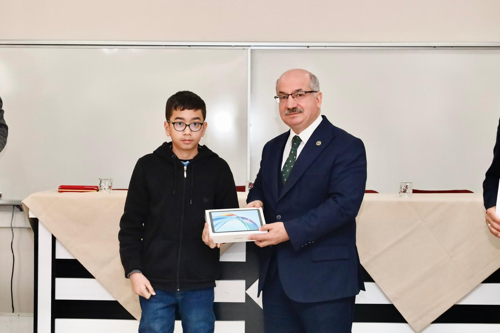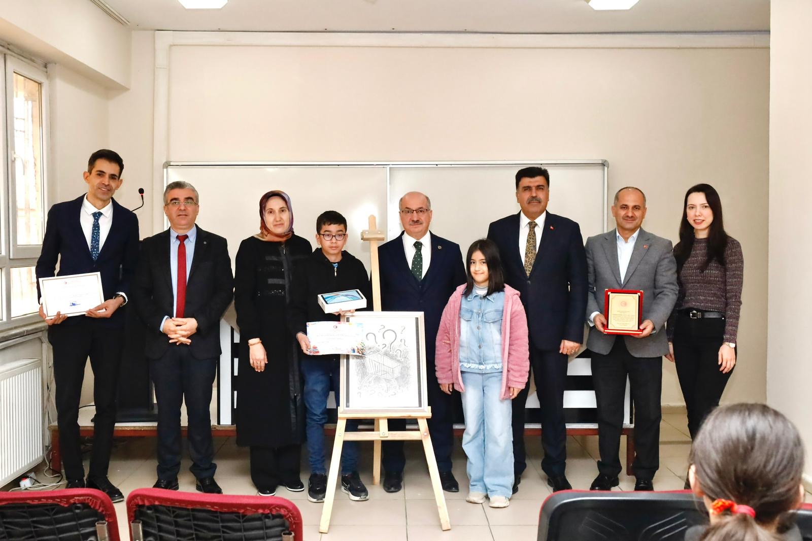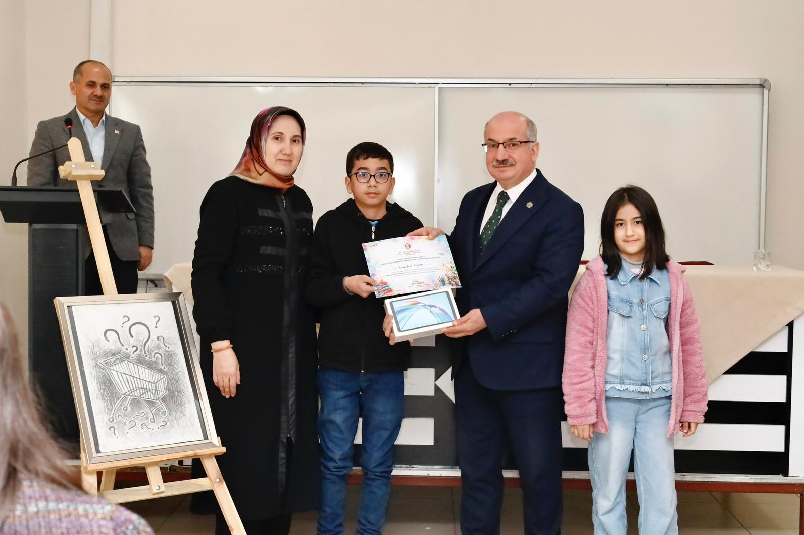 Ödül töreninde; il birincisi olan okula plaket, resim öğretmeni Selim Akkurt’a teşekkür belgesi ve öğrenci Yunus Emre Salcan’a Android tablet takdim edildi.