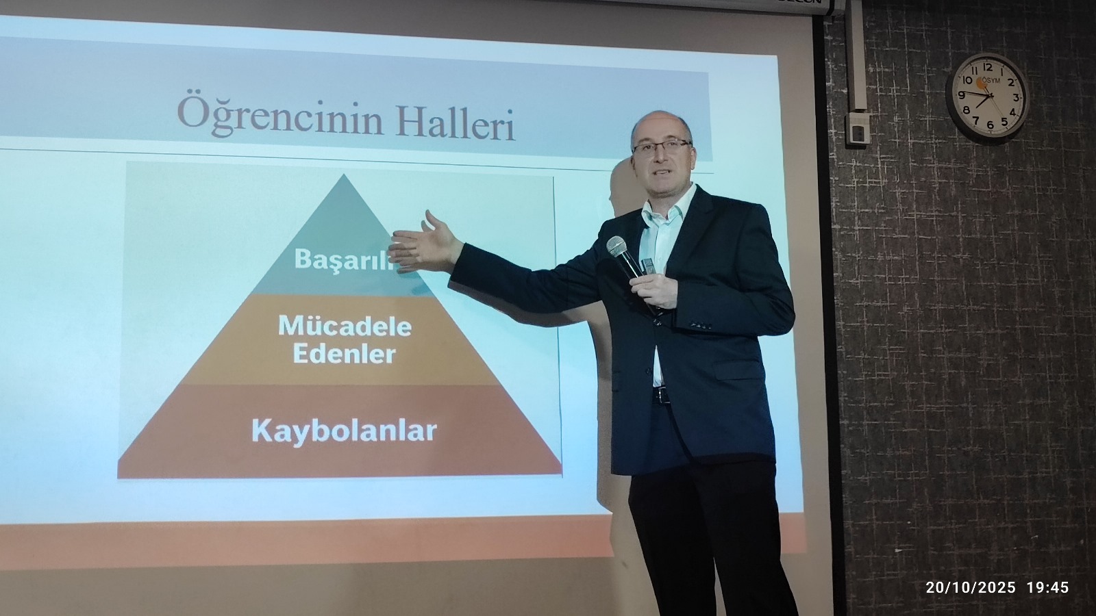 “Toplumsal Statü ve İmaj Perspektifinden Öğretmenin Toplumla İmtihanı” başlıklı söyleşide konuşan Prof. Dr. Serkan Ünsal, öğretmenlik mesleğini yalnızca bilgi aktaran bir alan olarak değil, insanı dönüştüren, kültür taşıyan ve değer inşa eden bir meslek olarak tanımladı.