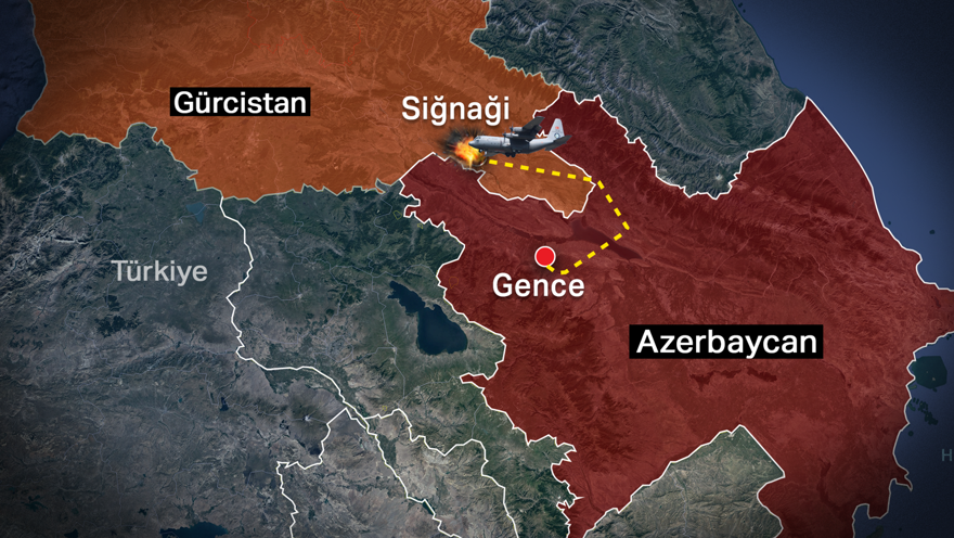 Gürcistan İçişleri Bakanlığı, Türk Hava Kuvvetlerine ait askeri nakliye uçağının Azerbaycan sınırına 5 kilometre mesafede, Signagi bölgesinde düştüğünü, kazayla ilgili soruşturma başlatıldığını duyurdu.