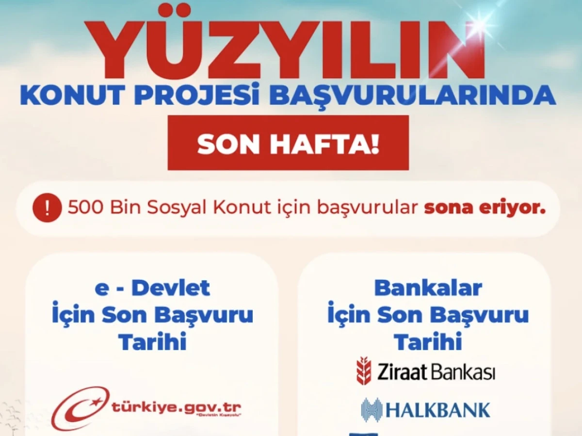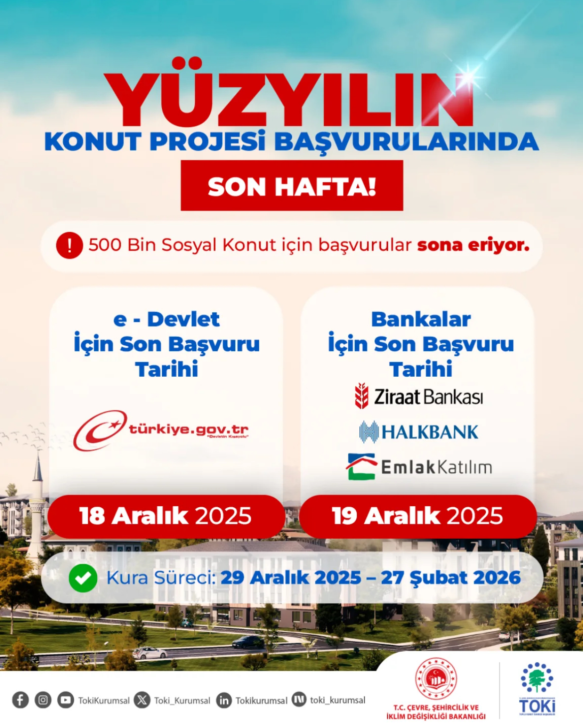 TOKİ 500 bin konut başvurularının son tarihi e-Devlet üzerinden 18 Aralık, Ziraat Bankası, Halk Bankası, Emlak Katılım Bankası üzerinden ise 19 Aralık'tır.
