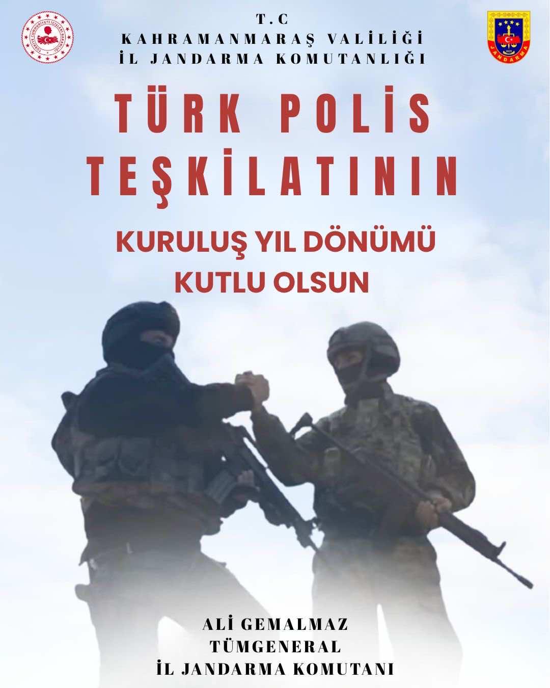 Kahramanmaraş İl Jandarma Komutanı Tümgeneral Ali Gemalmaz imzasıyla yayımlanan kutlama mesajında, görev başındaki tüm emniyet personeline başarı ve kolaylıklar dilendi.