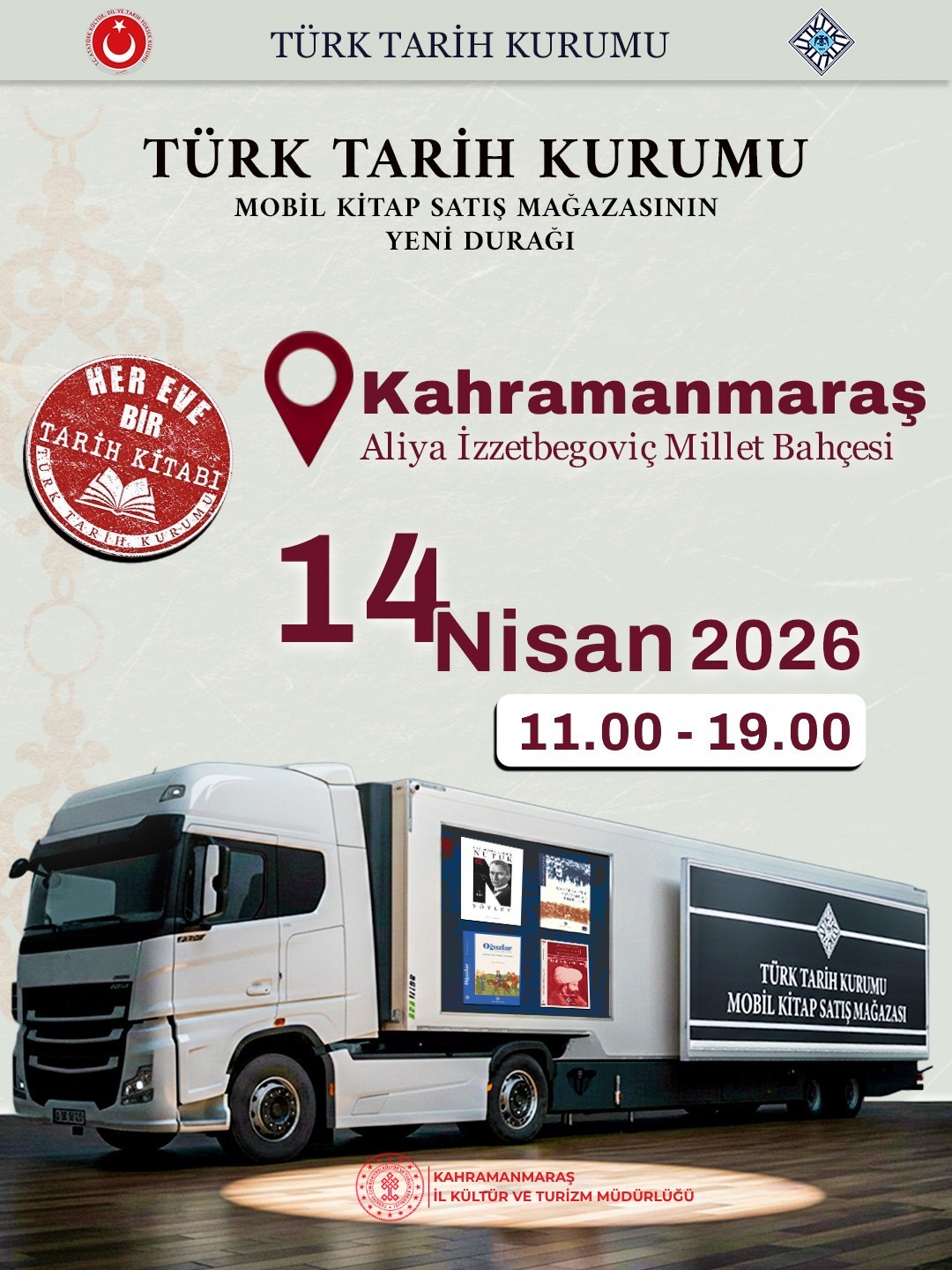T.C. Kültür ve Turizm Bakanlığı’na bağlı Tarih Kurumu " class="text-dark font-weight-bold" target="_blank">Türk Tarih Kurumu tarafından hayata geçirilen mobil satış tırı, 14 Nisan 2026 tarihinde Kahramanmaraş’ta okuyucularla buluşacak. Mobil satış noktası, saat 11.00 ile 19.00 arasında Aliya İzzetbegoviç Millet Parkı önünde hizmet verecek.