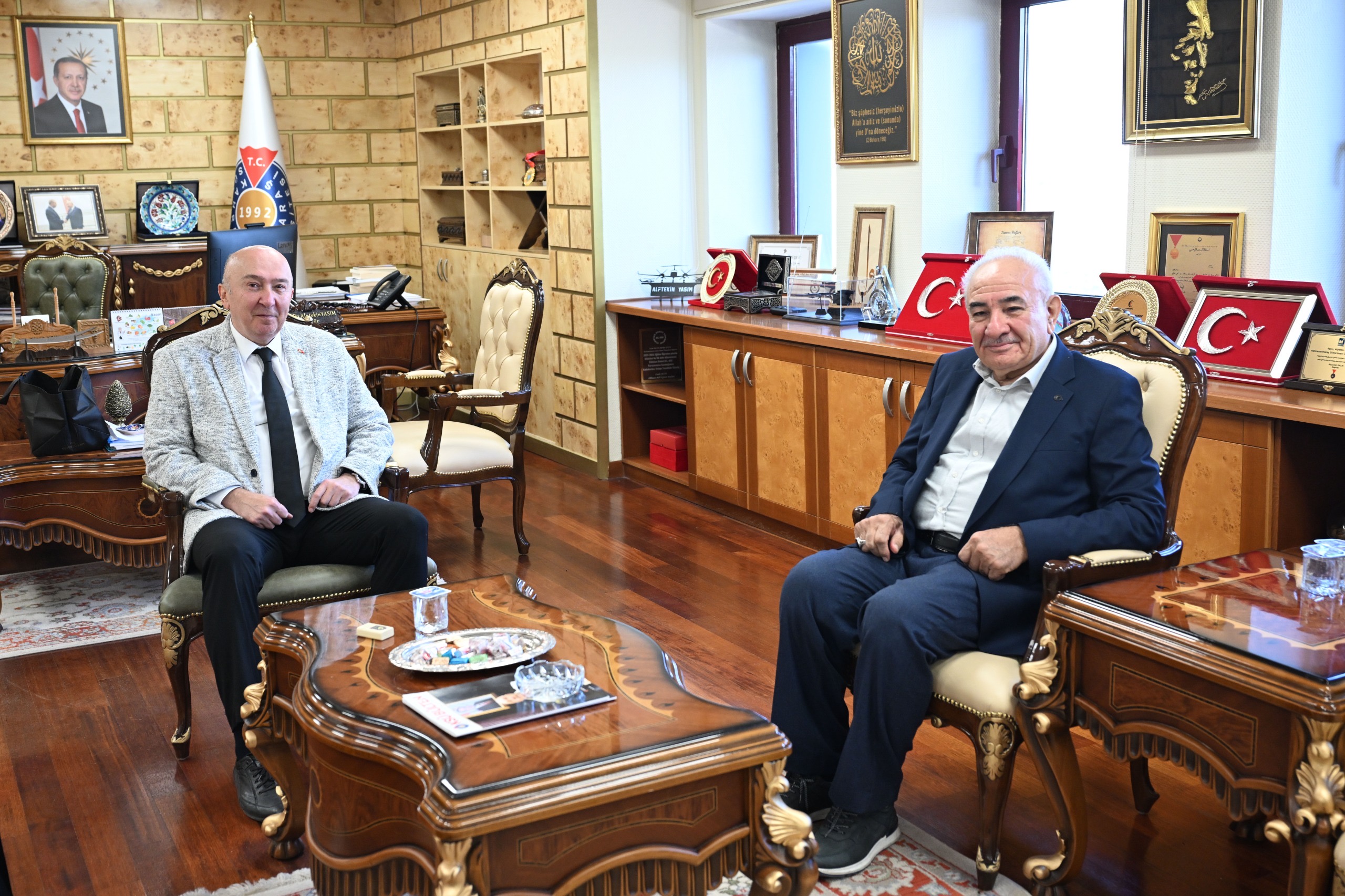 Üniversiteye gelişinde KSÜ Rektörü Prof. Dr. Alptekin Yasım’ı makamında ziyaret Vehbi Vakkasoğlu ziyarette, eğitimde değerler bütünlüğü ve irfan kavramının genç nesillerde yeniden anlam bulması üzerine görüş alışverişinde bulunuldu. Ziyarette Rektör Yardımcısı Prof. Dr. Orhan Doğan ve Doç. Dr. Ömer Süha Uslu da hazır bulundu.